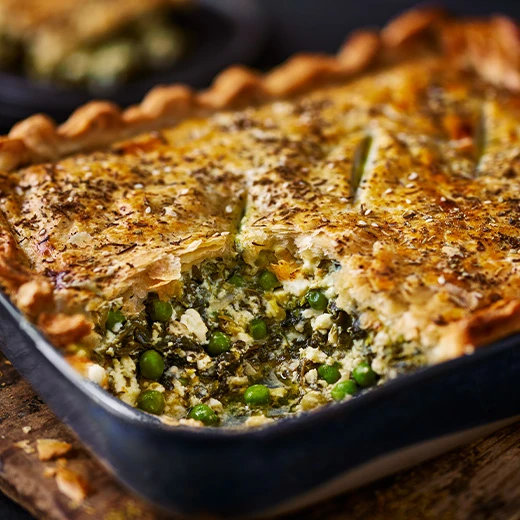 Inspired by the Greek classic spanakopita, this spinach and feta pie brings the flavours of the Mediterranean straight to your kitchen. Layers of fresh spinach, sweet onions, tangy feta, and fragrant herbs are baked beneath a golden, crisp all-butter puff pastry, creating an easy, veggie-friendly meal that the whole family will enjoy.