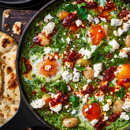 Herby, fresh, and full of flavour, this zingy green shakshuka features soft, creamy Collection Spanish White Beans, a medley of vibrant green vegetables, crumbled feta, and a drizzle of fiery rose harissa. Ready in just 15 minutes, it’s a fuss-free meal packed with colour and taste.