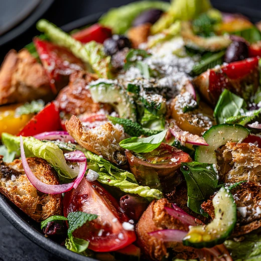Freezing your feta might sound unusual, but it creates a wonderful texture contrast and helps the cheese melt beautifully into sweet, ripe tomatoes in this fresh twist on the classic Greek salad. Golden, crunchy olive ciabatta croutons add the perfect finishing touch, bringing extra bite and flavour to every forkful.