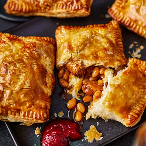 Sausage, bean and cheese melt: Tuck into golden, flaky pastry filled with mini sausages, melty cheese and baked beans.