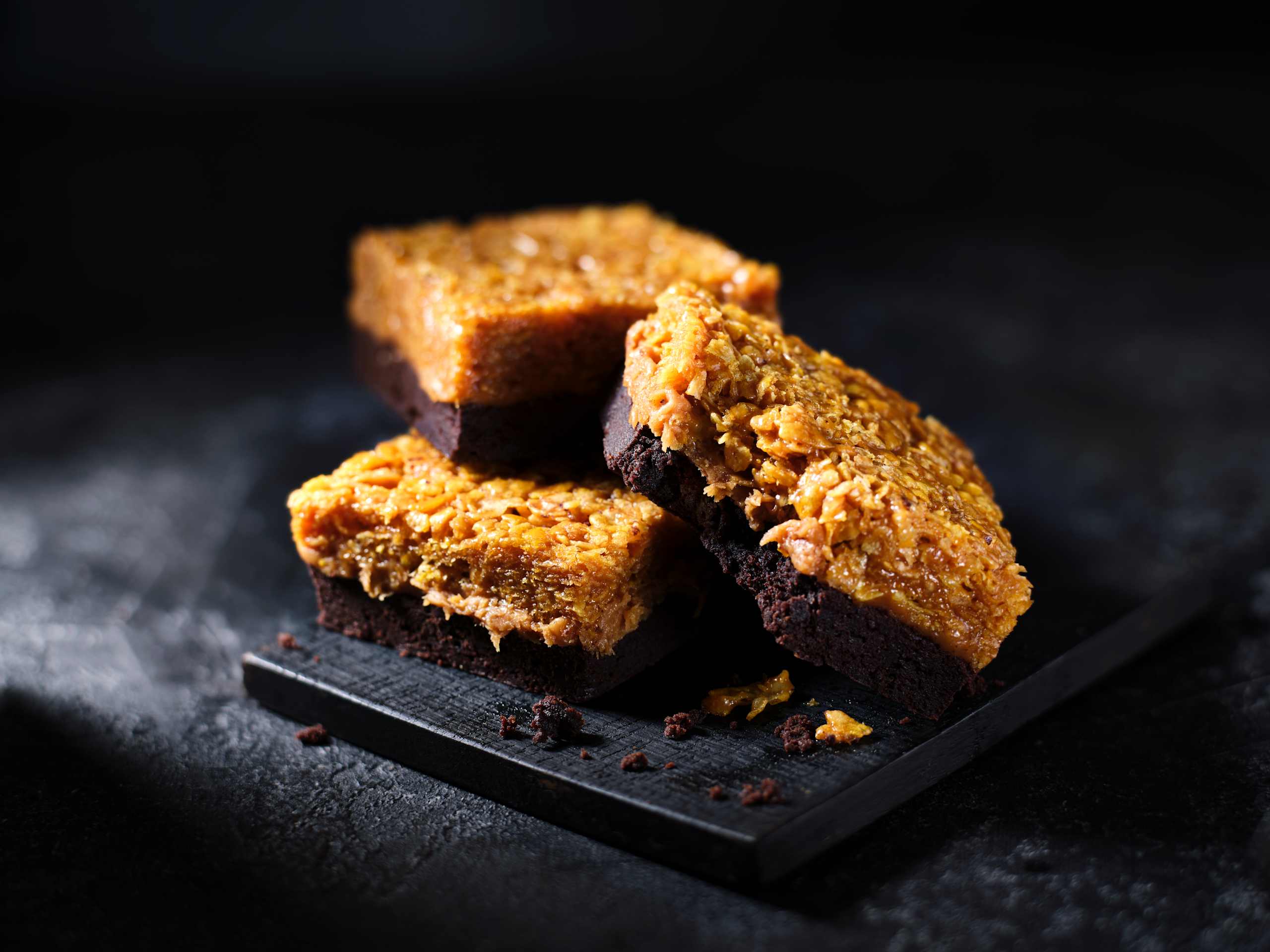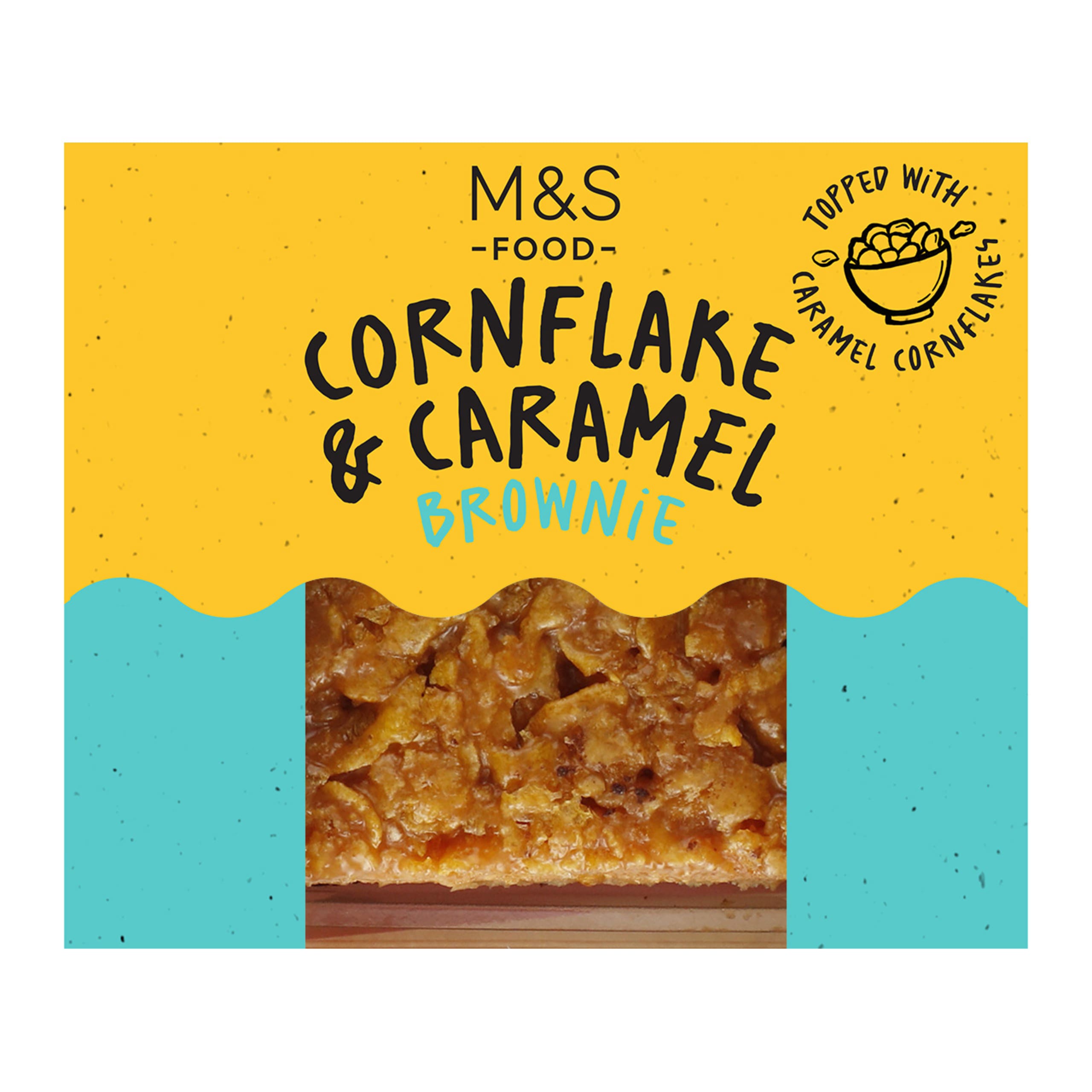 A rich, fudgy chocolate brownie is paired with sticky salted caramel and crunchy caramel‑coated cornflakes for a moreish mix of flavours and textures.