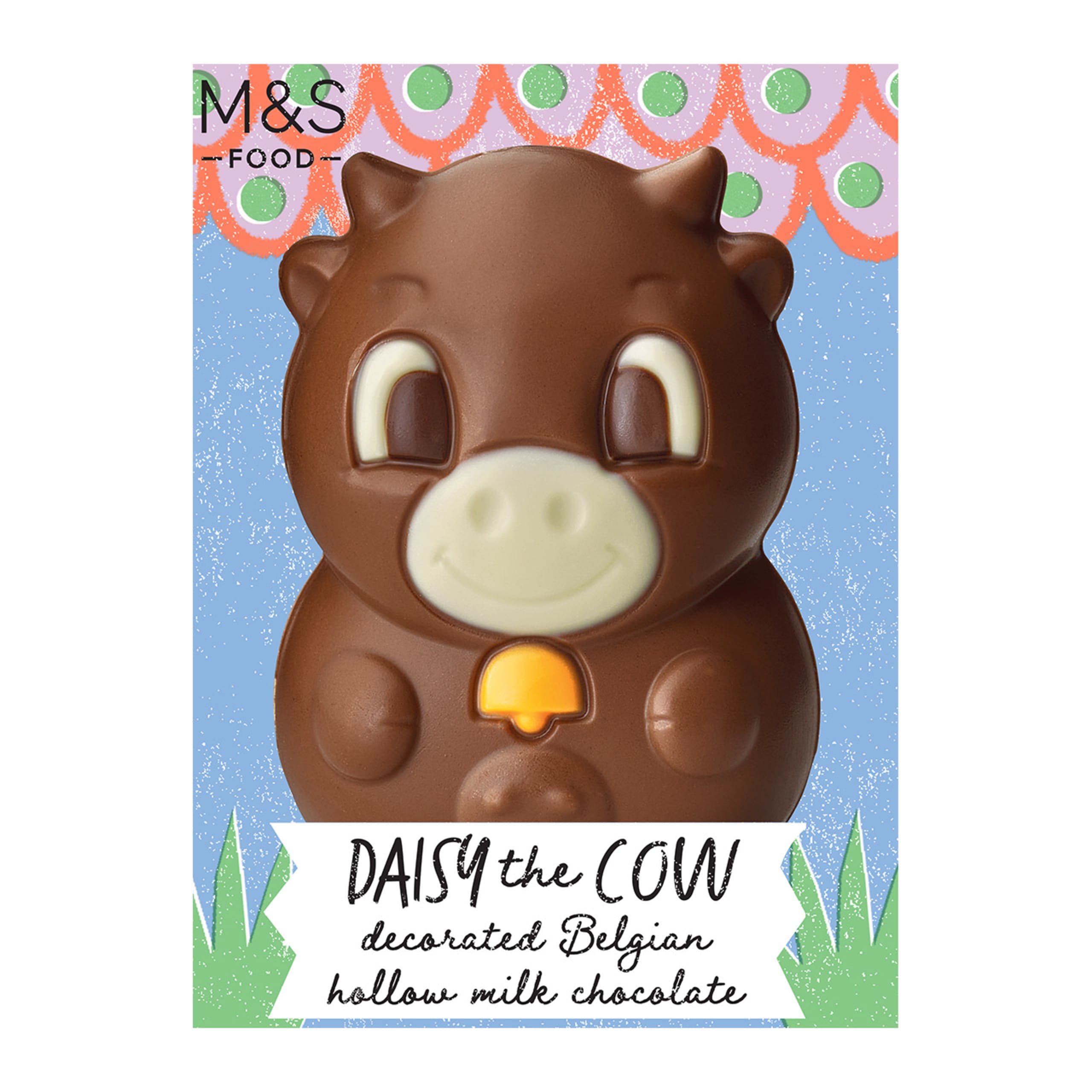 Invite Daisy the cow to your Easter celebrations. Made from luxurious Belgian milk chocolate, she's decorated with orange, dark and white chocolate for a charming finish.