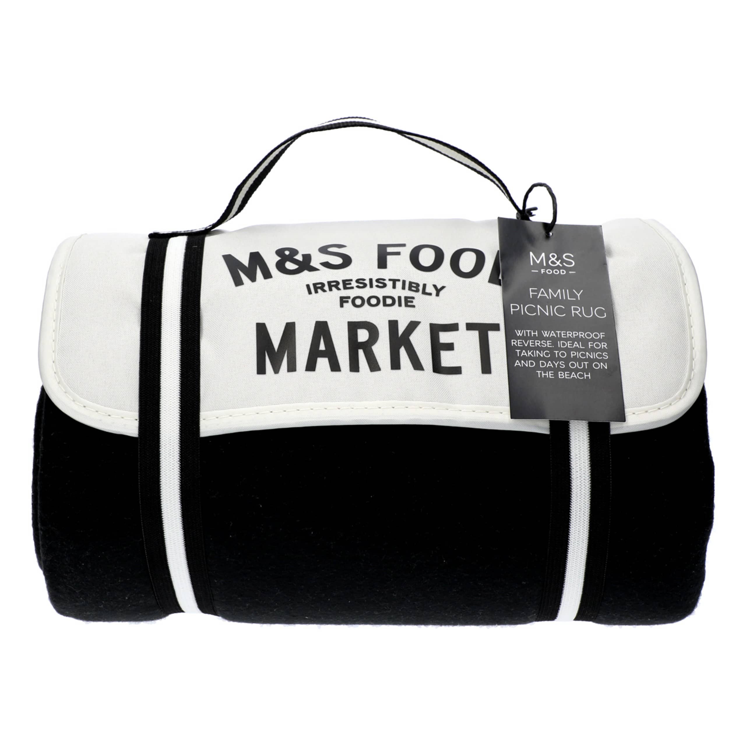 Our Family Picnic Rug has a practical roll-up design featuring a top handle for easy carry and a waterproof reverse for added convenience. Made to spread with all your favourite M&S picky bits.
