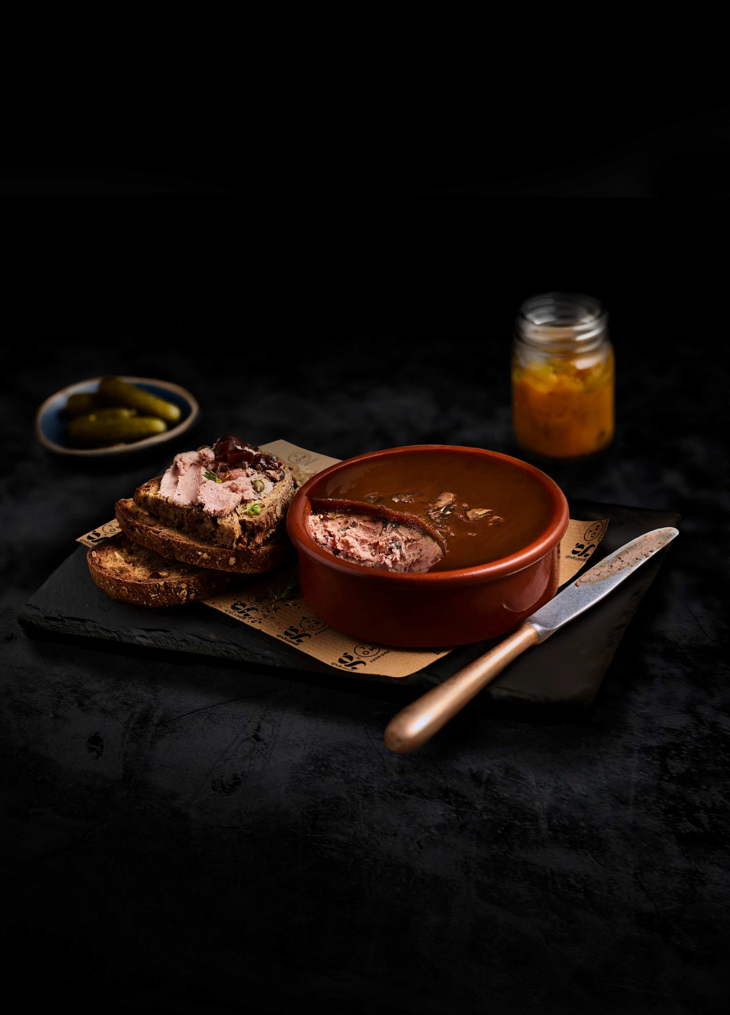 This rich and flavourful pate is carefully crafted with British pork liver, shoulder, belly and bacon, wholegrain mustard and green peppercorns, topped with roasted mushrooms and a porcini mushroom glaze.