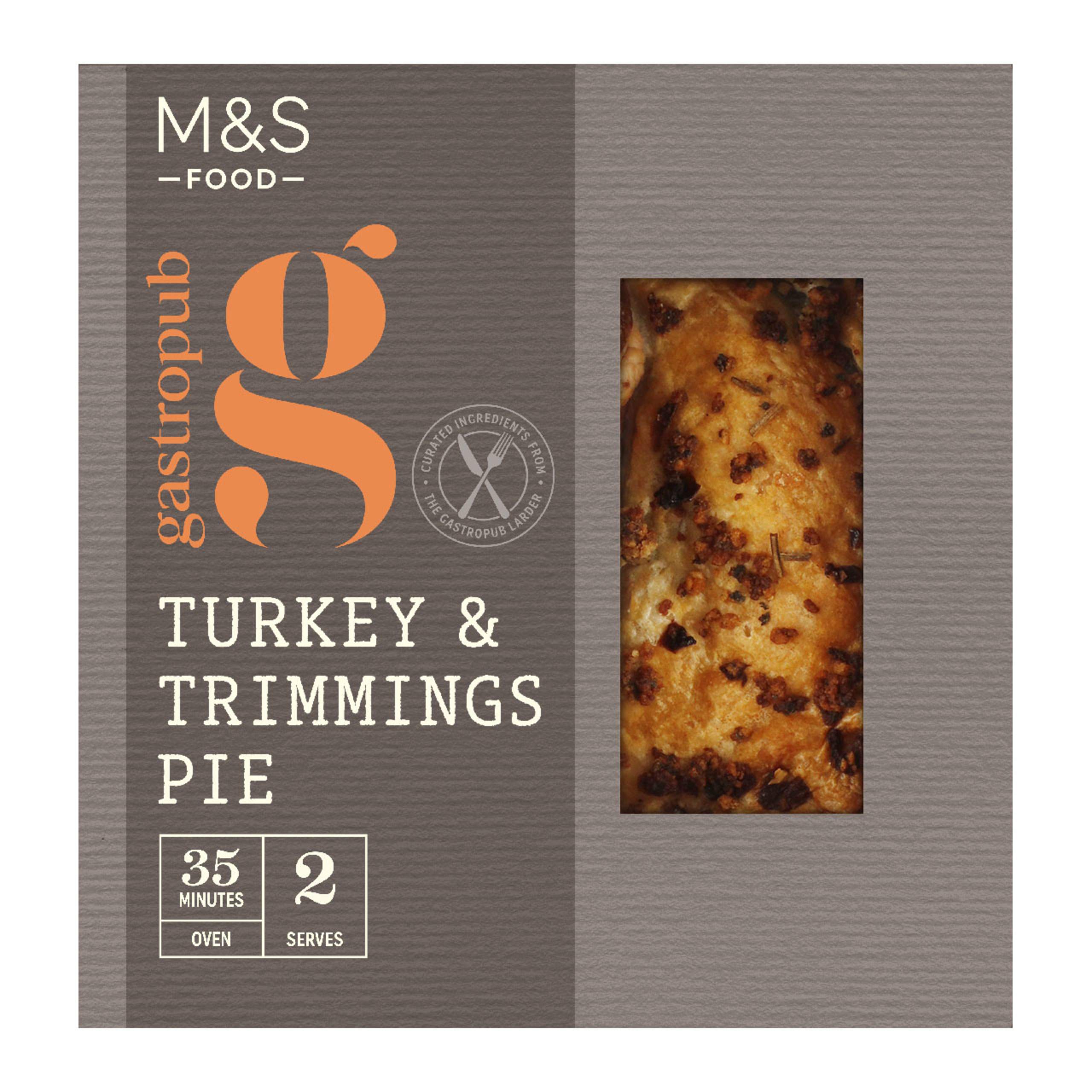 Enjoy a restaurant-quality meal for two at home with this Turkey and Trimmings Pie from our exclusive Gastropub range. It features British turkey thigh and smoked bacon in a sweet cranberry gravy, encased in flaky, golden, all-butter pastry, topped with a smoked bacon-wrapped pork chipolata and a caramelised onion and sage crumb.