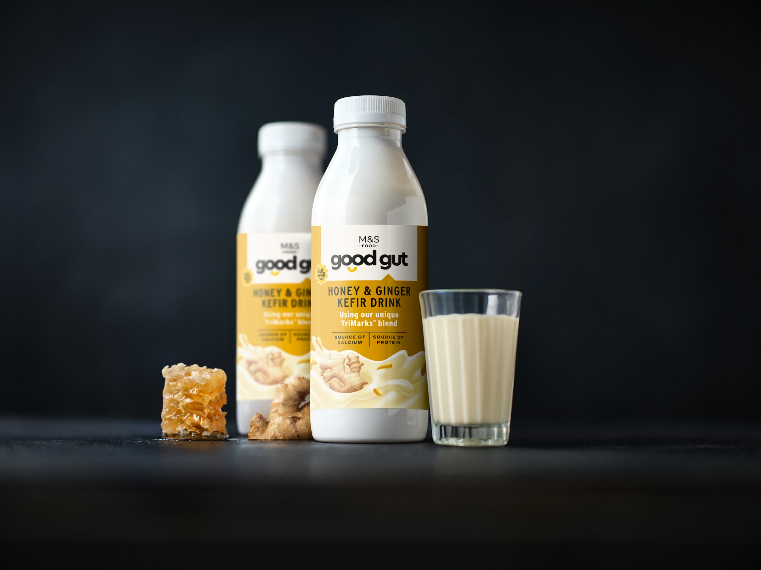 Kickstart your day with our zingy, warming Good Gut Honey and Ginger Kefir Drink. It's made with our unique, specially formulated TriMarks™ blend of fibre, live cultures, and Plenibiotic™ to support gut health and help you thrive from the inside out. Packed with live cultures, it's a source of calcium and protein.