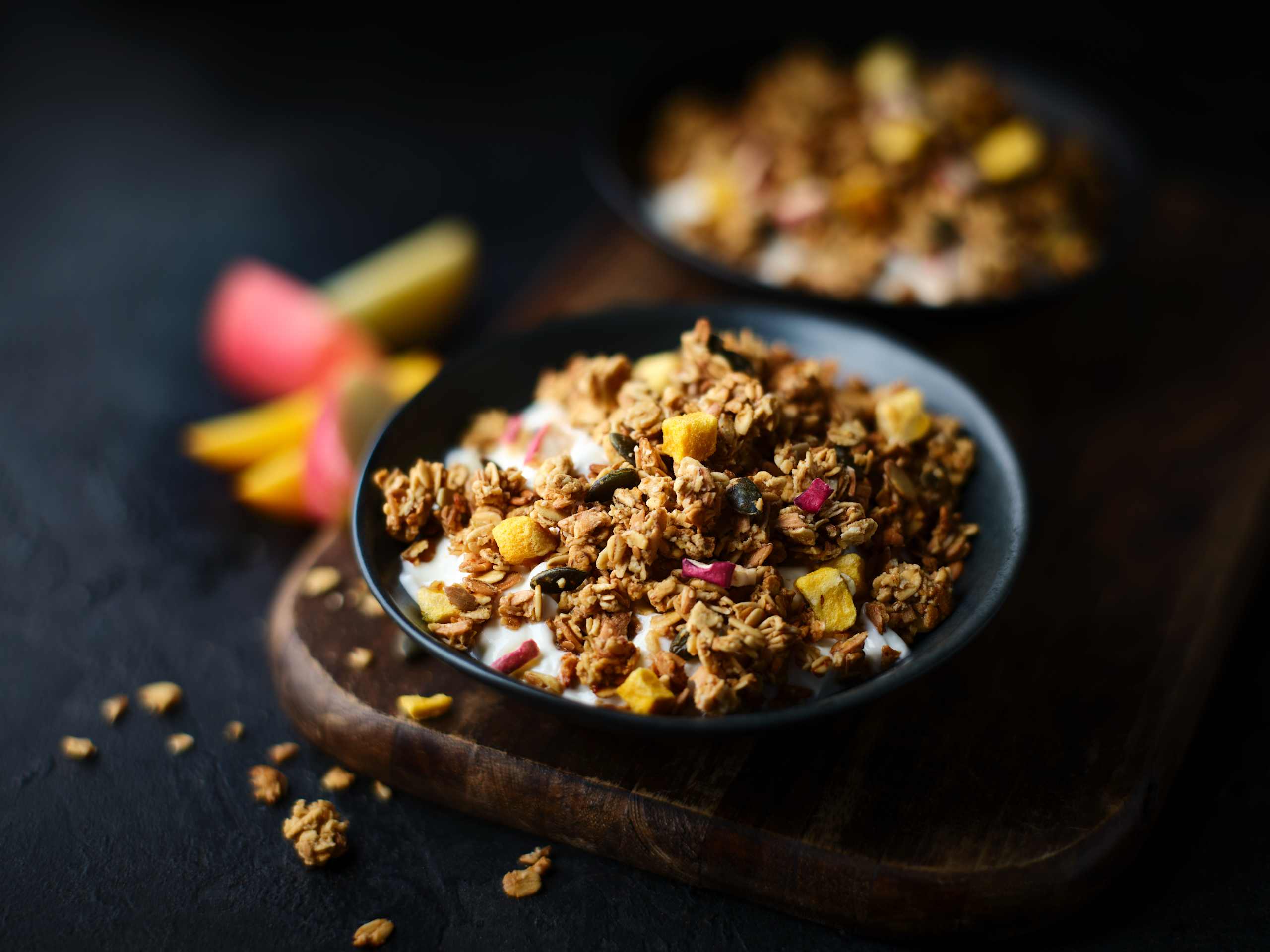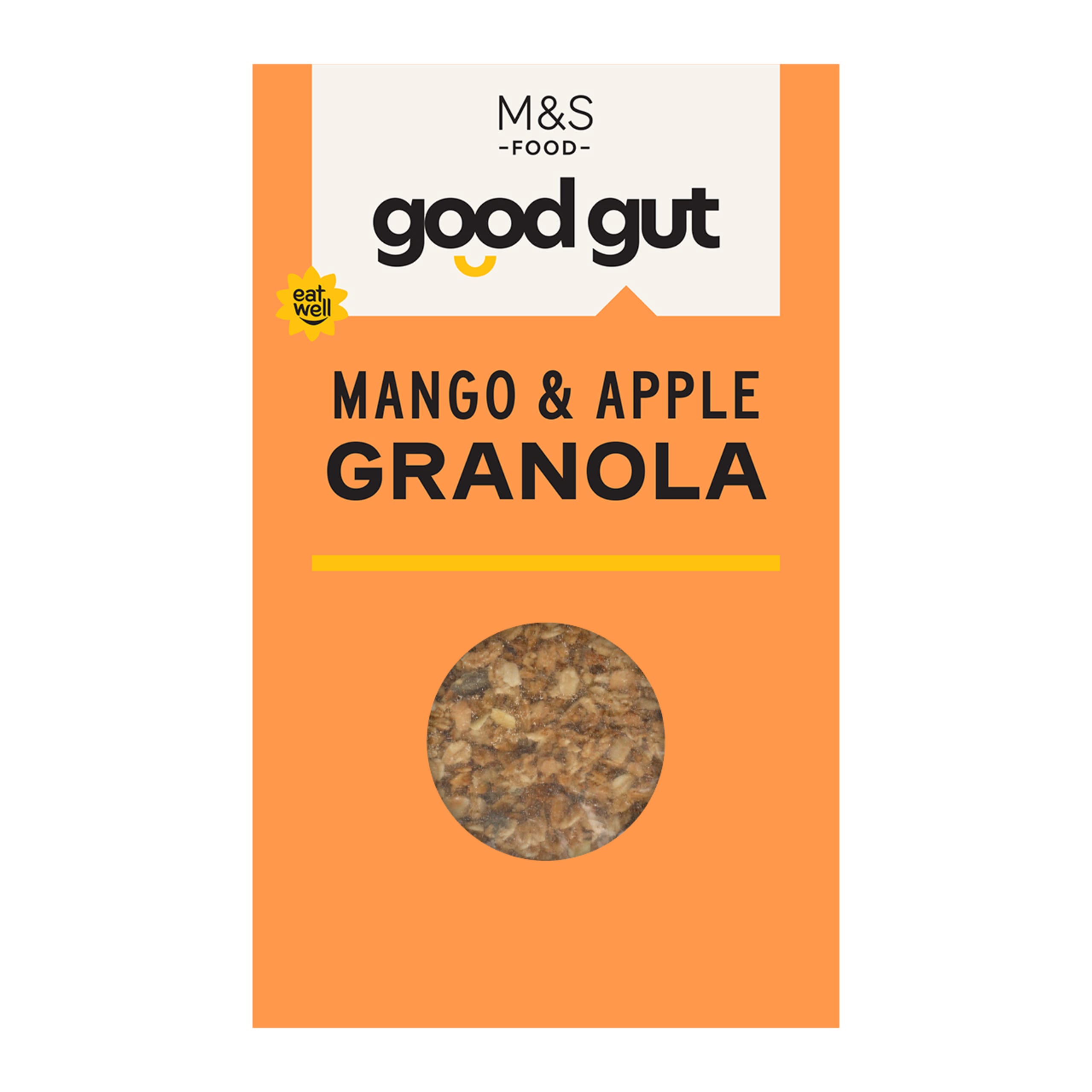 Our Good Gut Mango and Apple Granola is a fruity blend of mango, dried apple, wholegrain spelt, barley and mixed seeds to help you thrive on the inside. It's high in fibre and features our Eat Well flower, so you know it’s a healthy choice and can be enjoyed as part of a balanced diet.