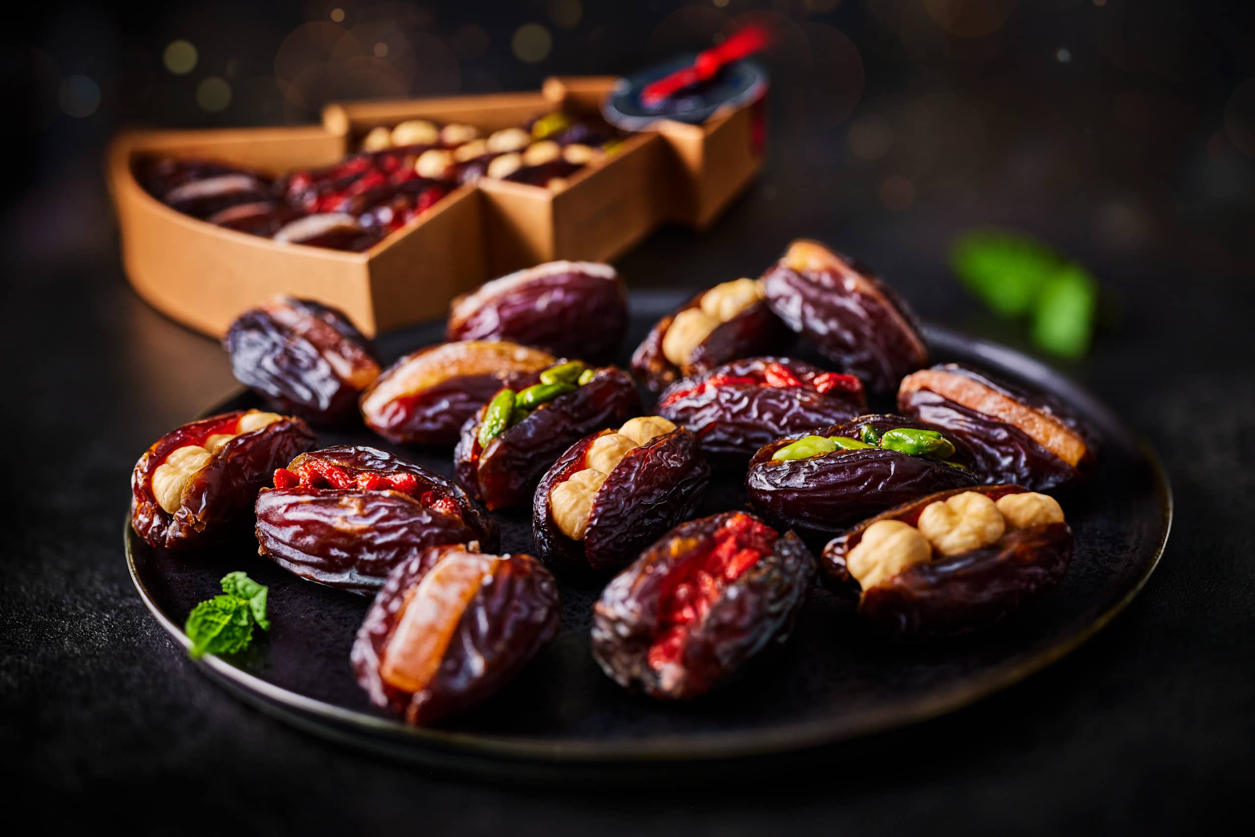 Pitted, caramel-like medjool dates with irresistible fruit and nut fillings: pistachio nuts, chopped caramelised hazelnuts, candied orange peel, marzipan and pecan nuts and marzipan and pistachio nuts.