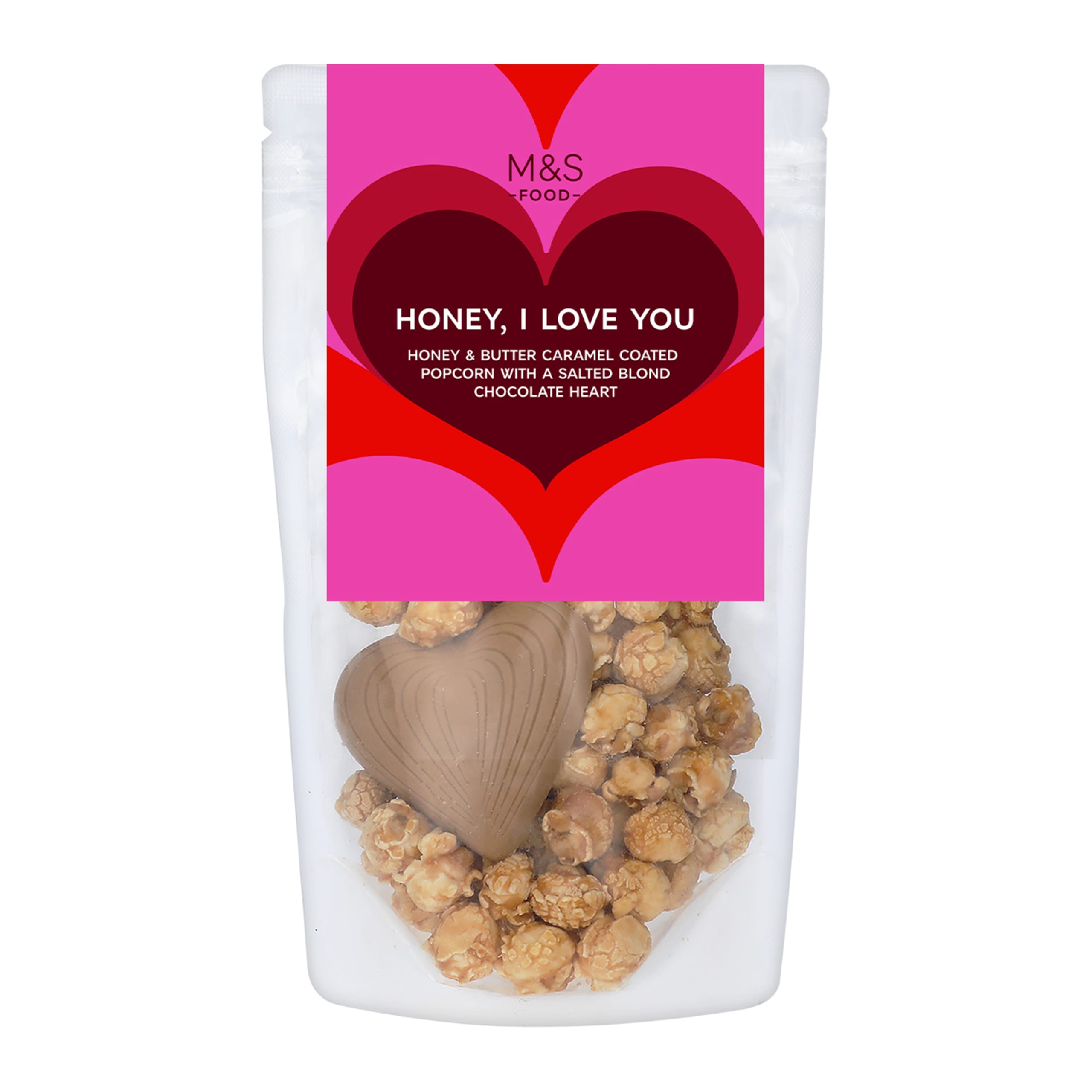 Our Honey, I Love You popcorn combines honey and butter caramel-coated kernels with a unique centre of salted blond chocolate, making a sweet yet subtly salty, crunchy treat. Enjoy this moreish mix of textures and rich flavours.