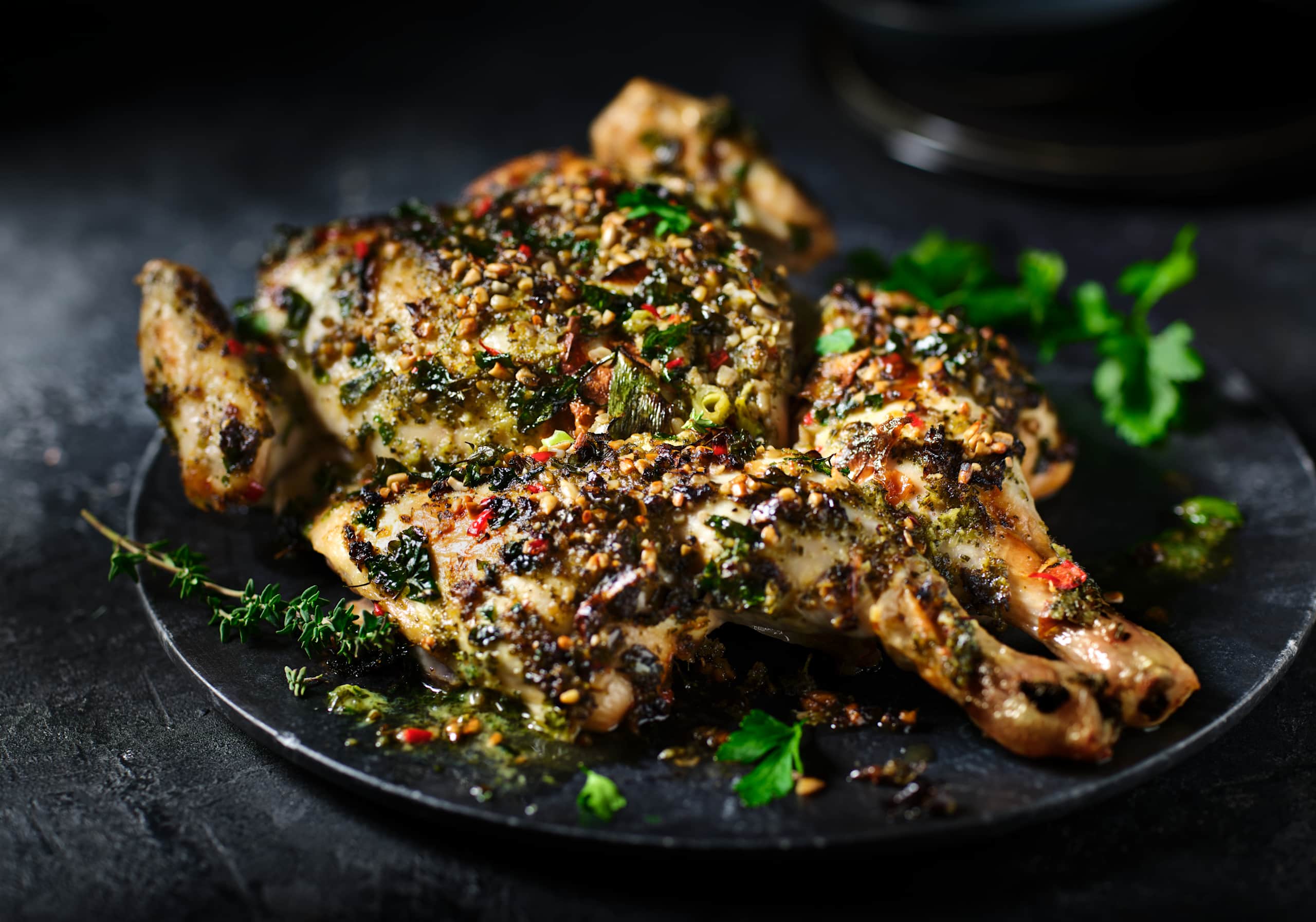 British chicken from farms we know and trust, spatchcocked for even cooking and topped with a vibrant marinade of spring onion, coriander and green chilli. Finished with seasoned sunflower seeds and a green jalapeño butter, it delivers a mild, fresh heat and cooks in just 75 minutes.