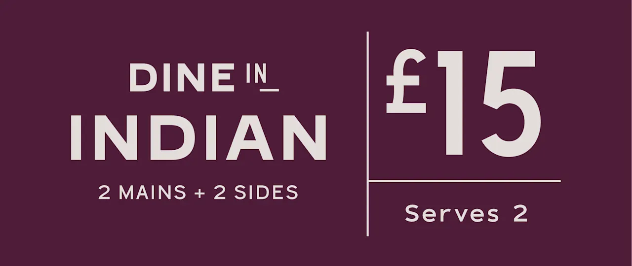 Get an Indian Dine In to enjoy two Indian mains and two sides for £15. It includes a selection of flavour-packed Indian dishes, prepared to our exclusive recipes from our kitchen to yours.