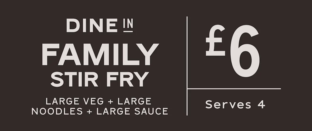 Our Family Stir Fry Dine In deal serves four for just £6 – the ultimate speedy, please-all midweek meal. Choose from a selection of prepped vegetables, noodles, and sauce to feed the family. Browse the full menu below.