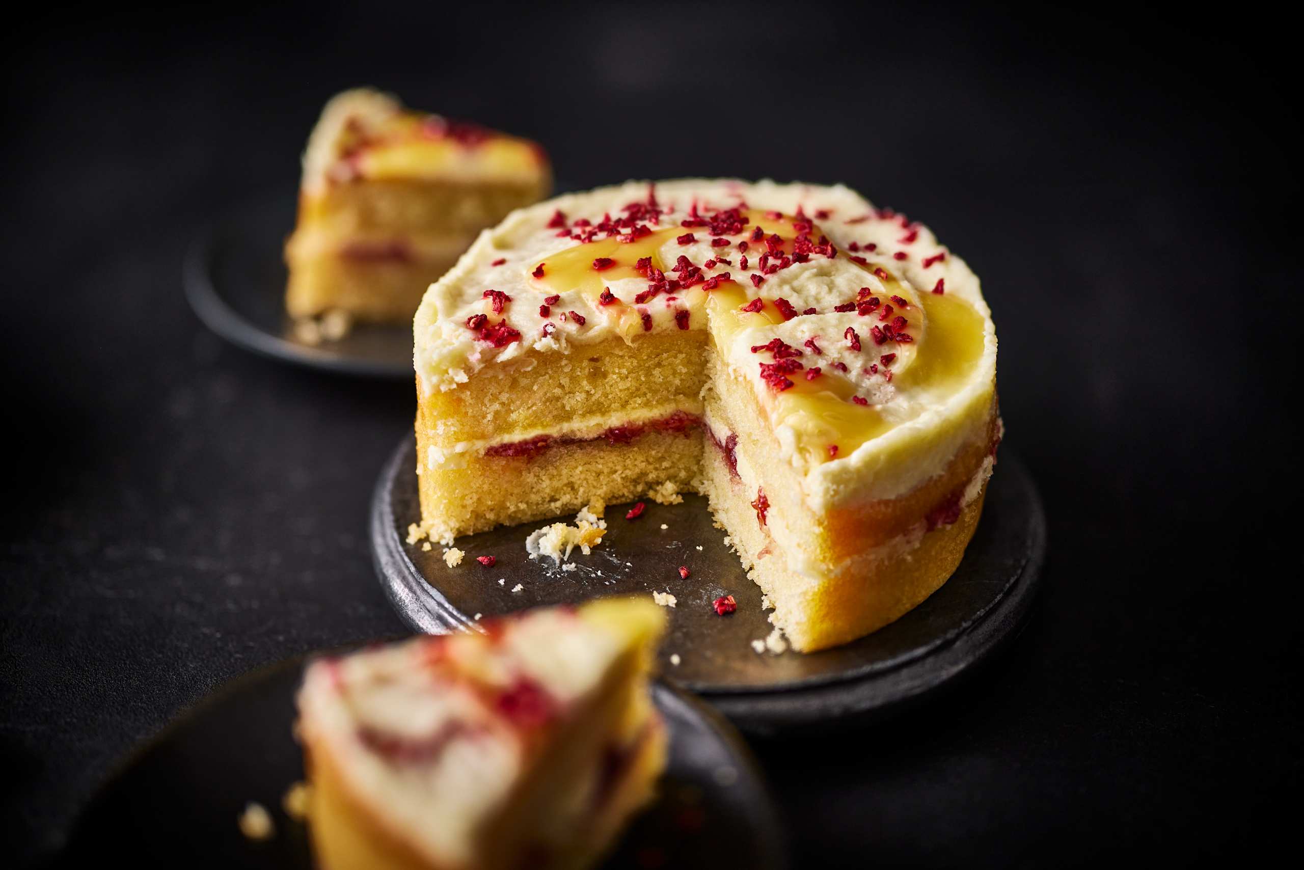 Our Lemon and Raspberry Cake pairs a light, fluffy sponge with a smooth lemon curd cream cheese frosting and a layer of sweet raspberry jam. Finished with a tangy lemon curd and a crunchy freeze-dried raspberry crumb, it brings together bright flavours and delightful contrasts in texture.
