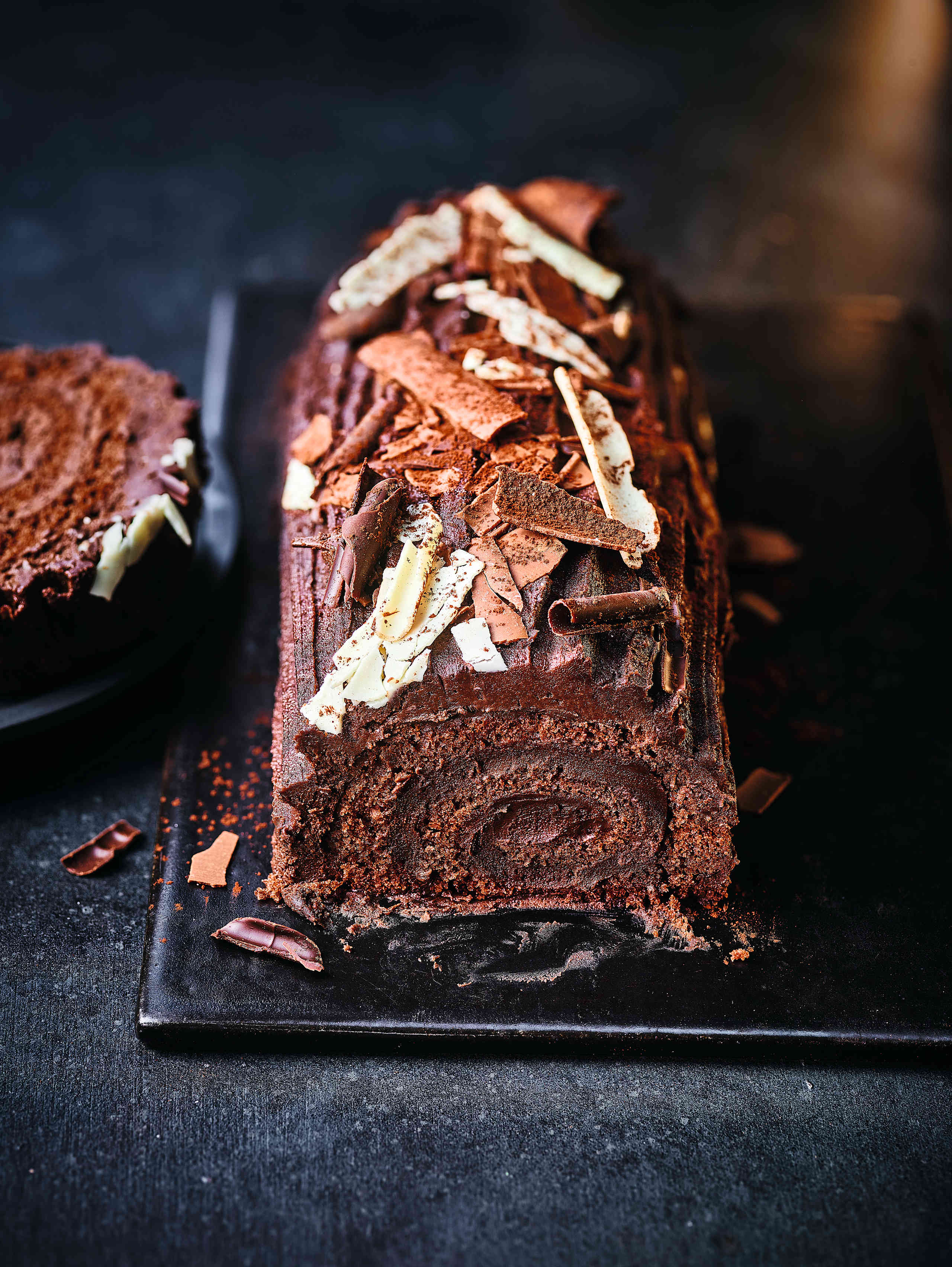 Our Made Without Wheat Chocolate Yule Log is a gluten-free treat, featuring a rich chocolate sponge layered thickly with velvety chocolate buttercream and adorned with elegant chocolate curls.