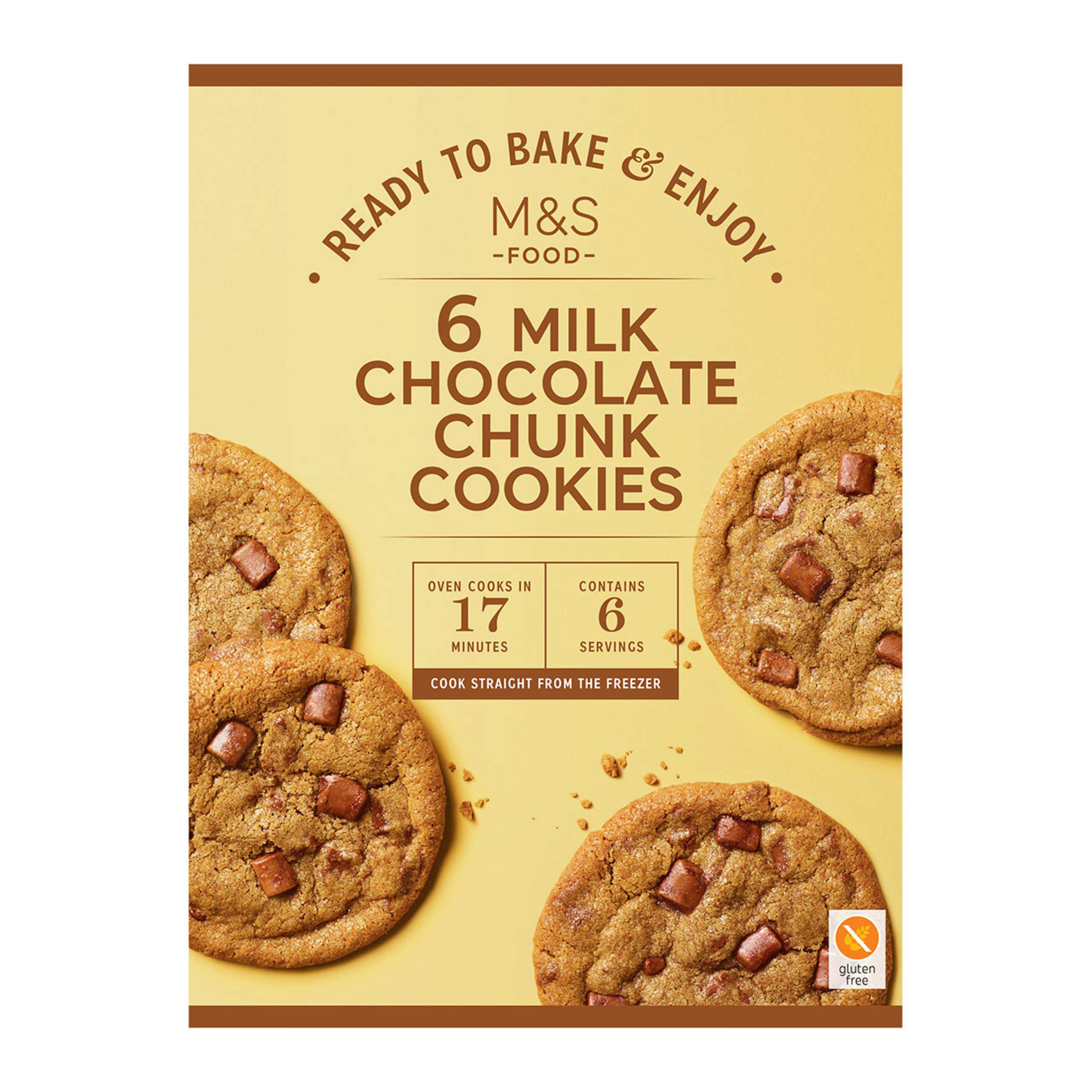 Our 6 Milk Chocolate Chunk Cookies are ready to bake from the freezer. They feature Belgian chocolate chunks embedded in gluten-free cookie dough. Each cookie has a melt-in-the-mouth texture, best enjoyed warm from the oven in just 17 minutes.
