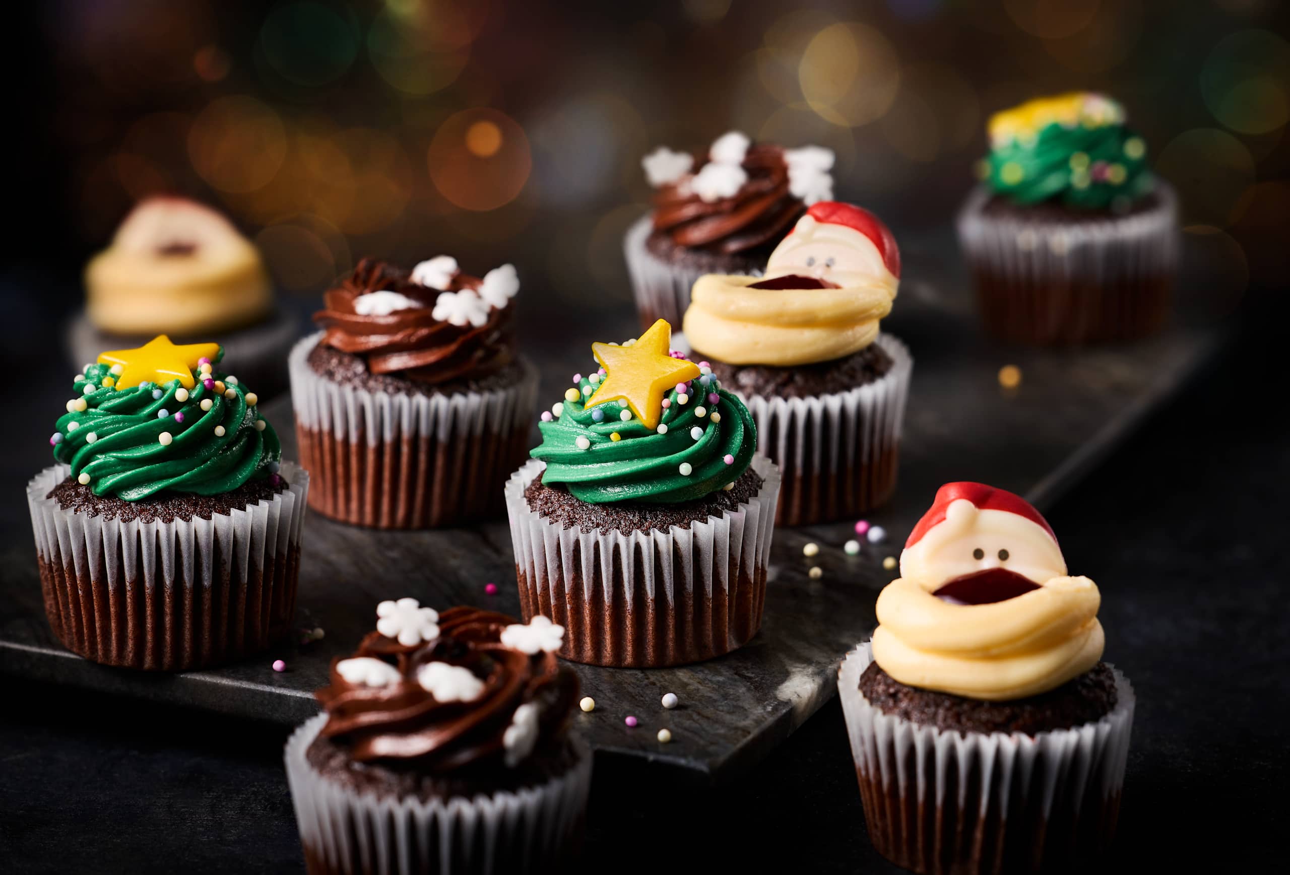 These hand-decorated chocolate sponge cupcakes add festive fun to the table. Each one is topped with smooth chocolate or vanilla buttercream and finished with colourful sprinkles or edible decorations, including Santa faces and stars.