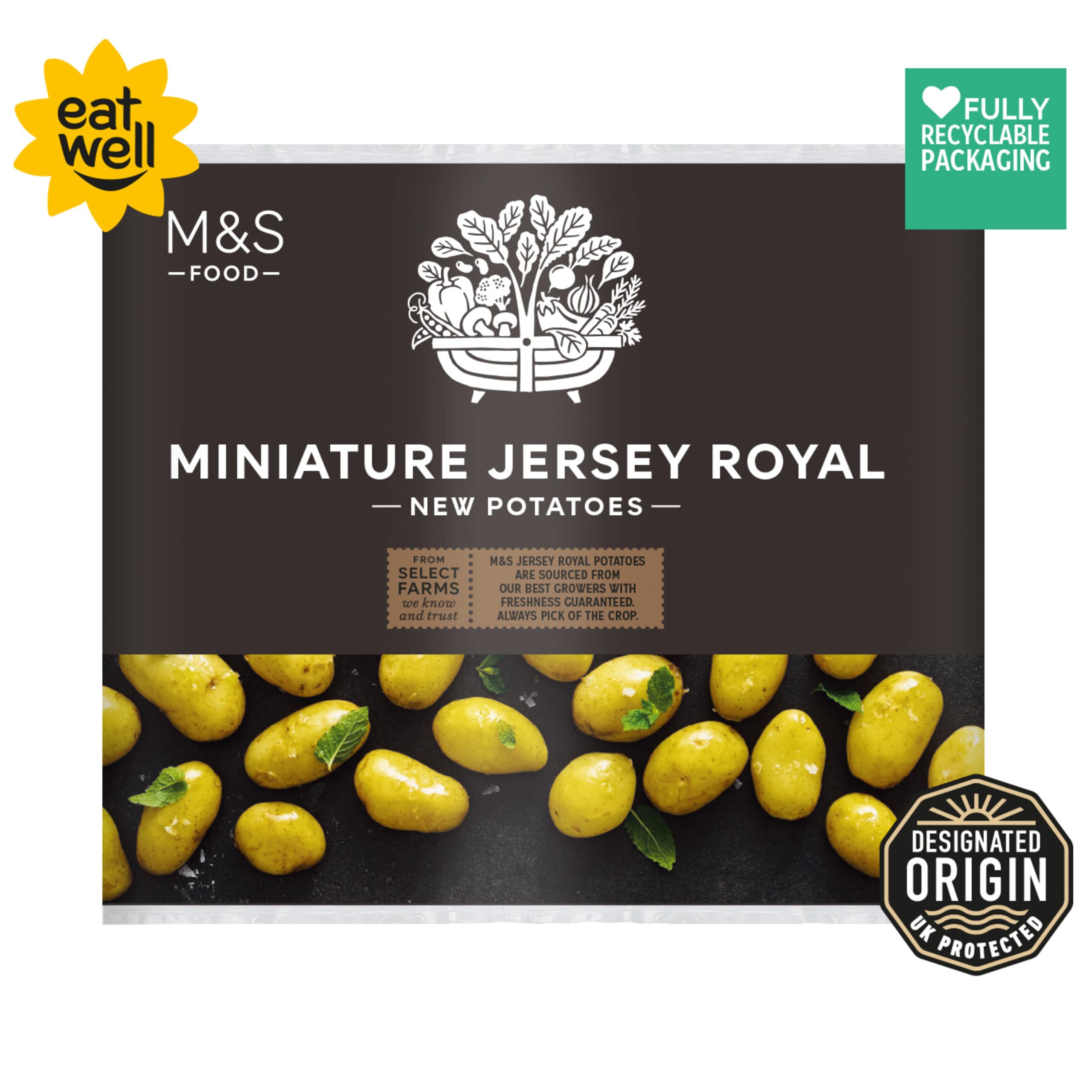 Our Miniature Jersey Royal New Potatoes are grown exclusively on the island of Jersey, where we have a dedicated team who ensure we only get the pick of the crop. The island's mild climate and rich, fertile earth gives these miniature spuds a beautifully nutty, buttery flavour.