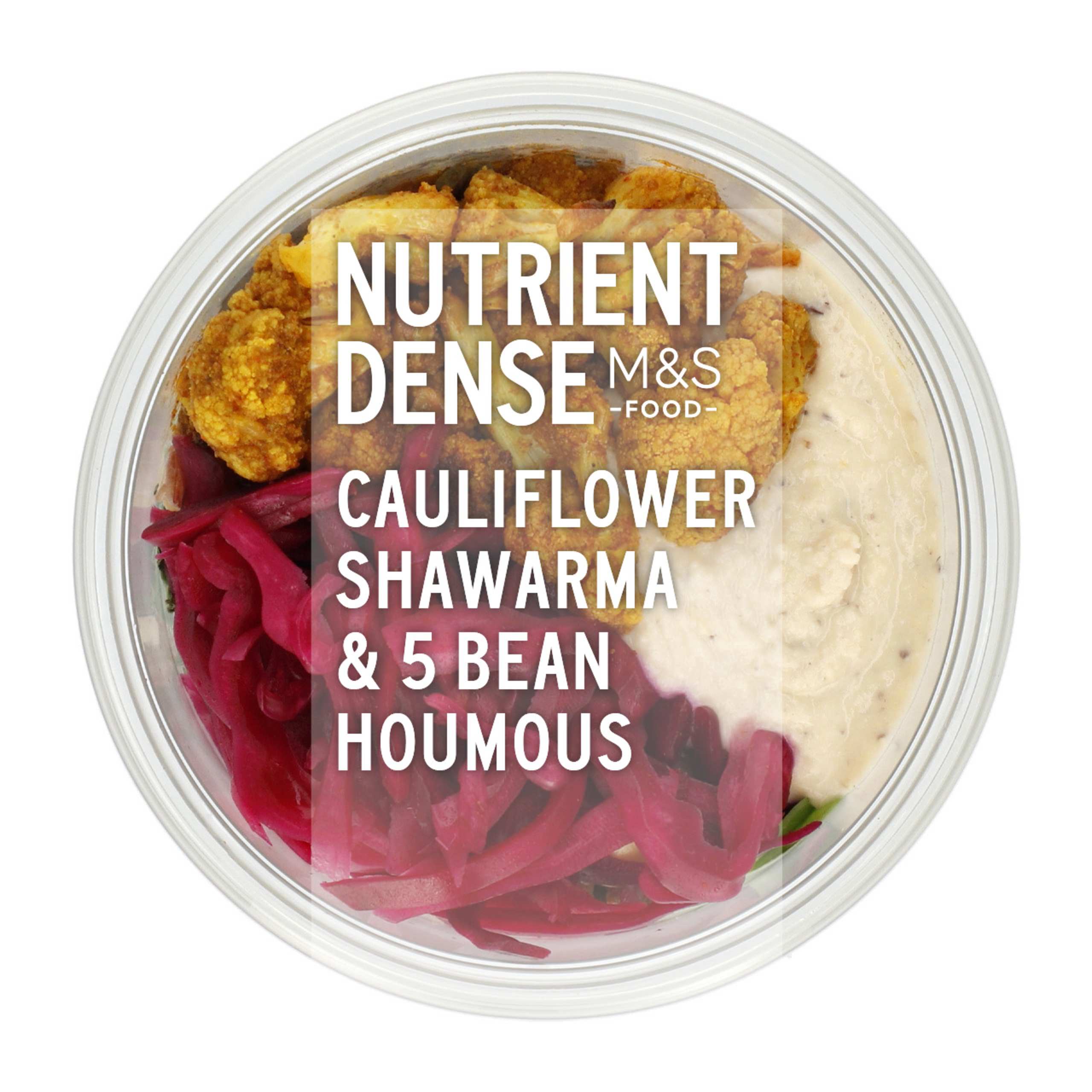 Our Cauliflower Shawarma and Five Bean Houmous combines tender cauliflower, hearty grains and chickpeas with spinach and a tangy spiced cabbage, all drizzled with flavourful olive oil.