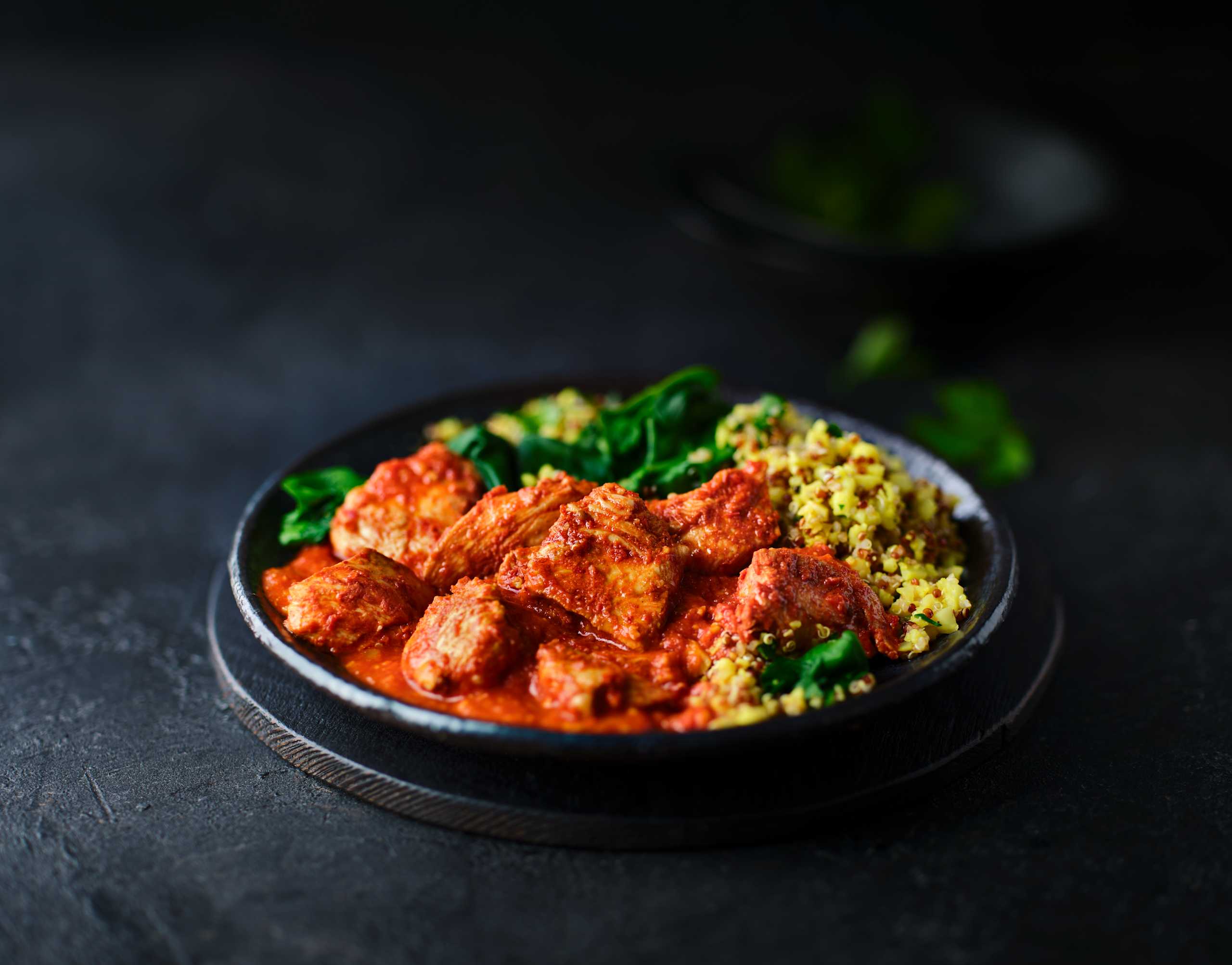 Succulent British chicken in a smoky romesco sauce made from sundried tomatoes and red peppers, spinach and a grain mix of quinoa and cauliflower, this fuss-free lunch or easy dinner contains 8g fibre, 35g protein and only 460 calories.
