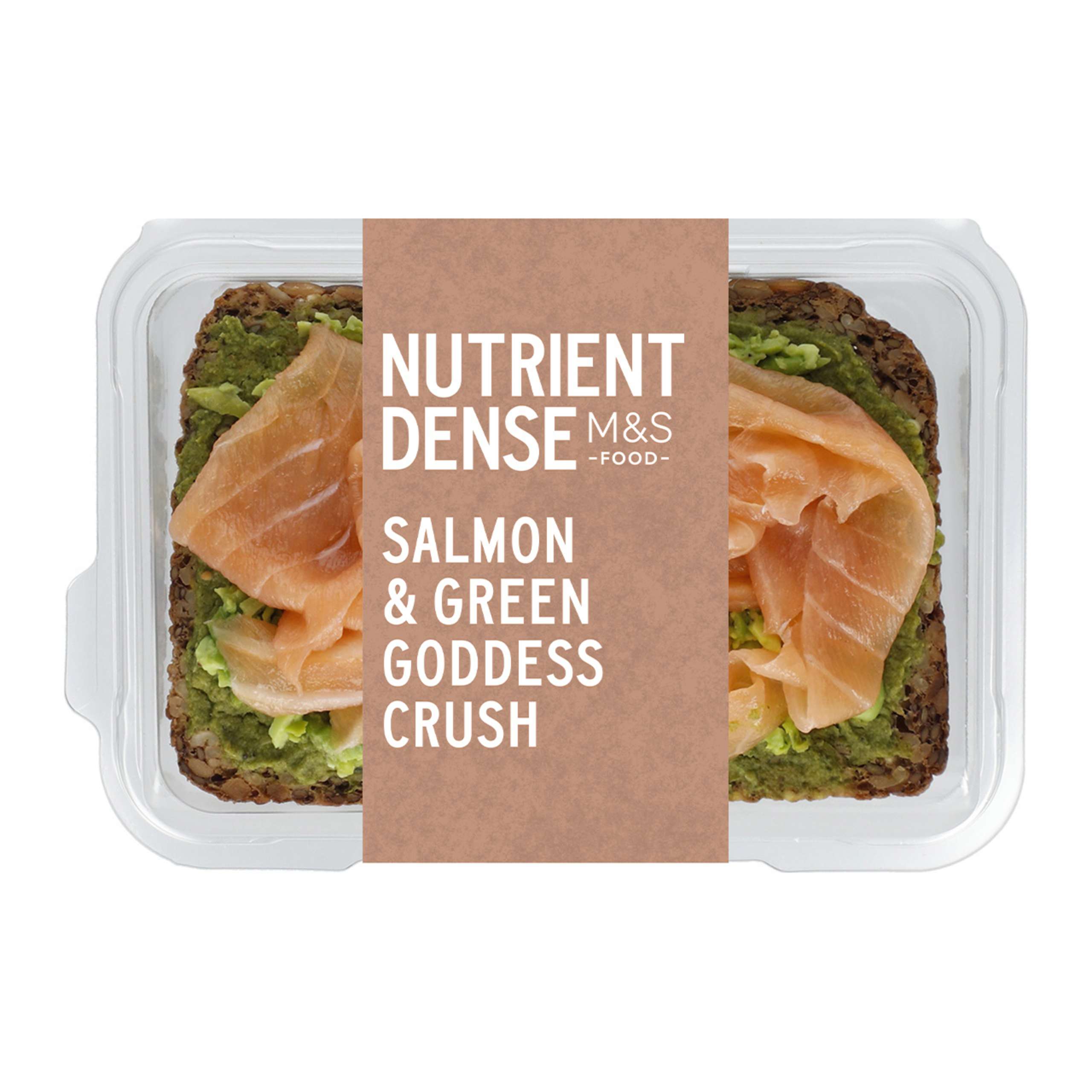 Oak-smoked Scottish salmon is layered with pea and edamame soybean crush, and spiced pea and courgette purée, on our Nutrient Dens super-seeded oaty bread. This nutrient-rich on-the-go lunch contains 9.3g fibre, 19.5g protein and 288 calories.