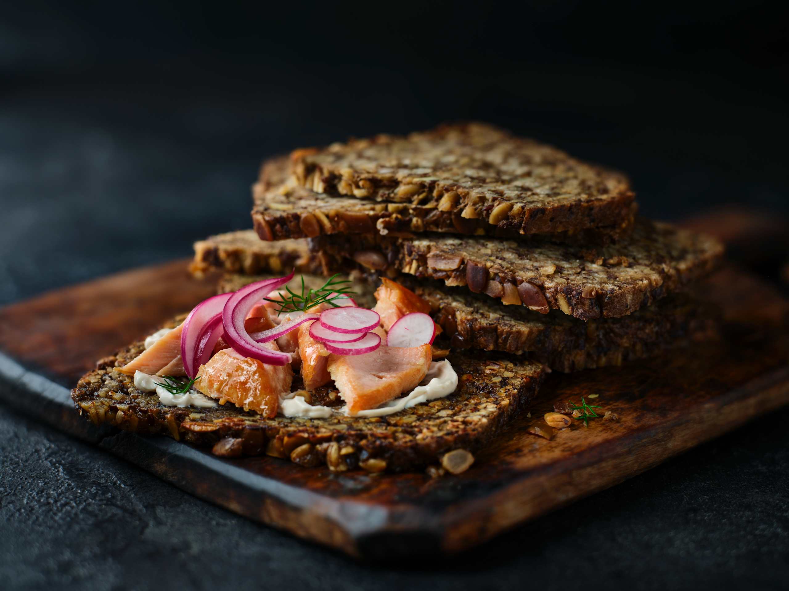 This flavour-packed oat bread is made with a mix of linseeds, sunflower and pumpkin seeds. It's high in fibre with 7g per slice, plus 7g protein and 166 calories. Try topped with smoked mackerel and a zingy beetroot dip, jammy boiled eggs and ricotta, or peanut butter and smashed raspberries.