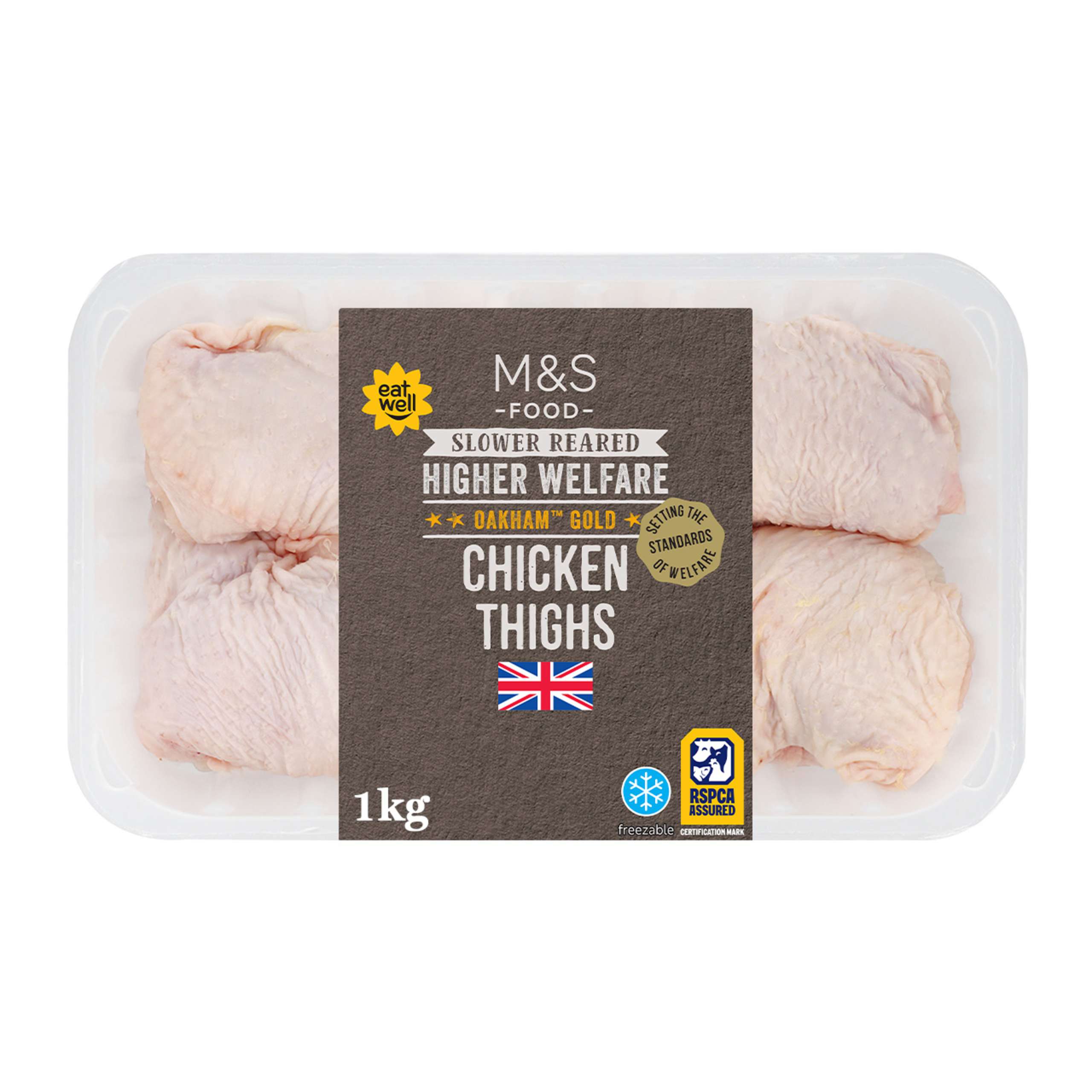 Our Oakham Gold British Chicken Thighs are sourced from RSPCA Assured, M&S Select Farms. The chickens are naturally slower reared and fed a nutritious multi-grain diet, ensuring exceptional flavour and tenderness. Naturally high in protein and featuring our Eat Well flower, these chicken thighs are a healthy choice that can be enjoyed as part of a balanced diet.