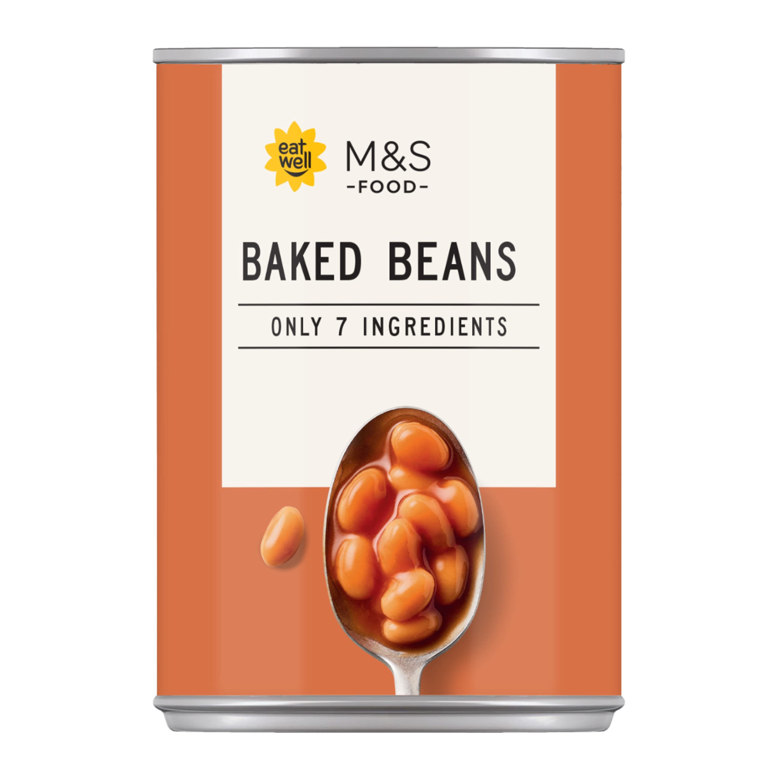Baked Beans made with seven ingredients: haricot beans, tomatoes, water, agave syrup, cornflour, salt and paprika.
