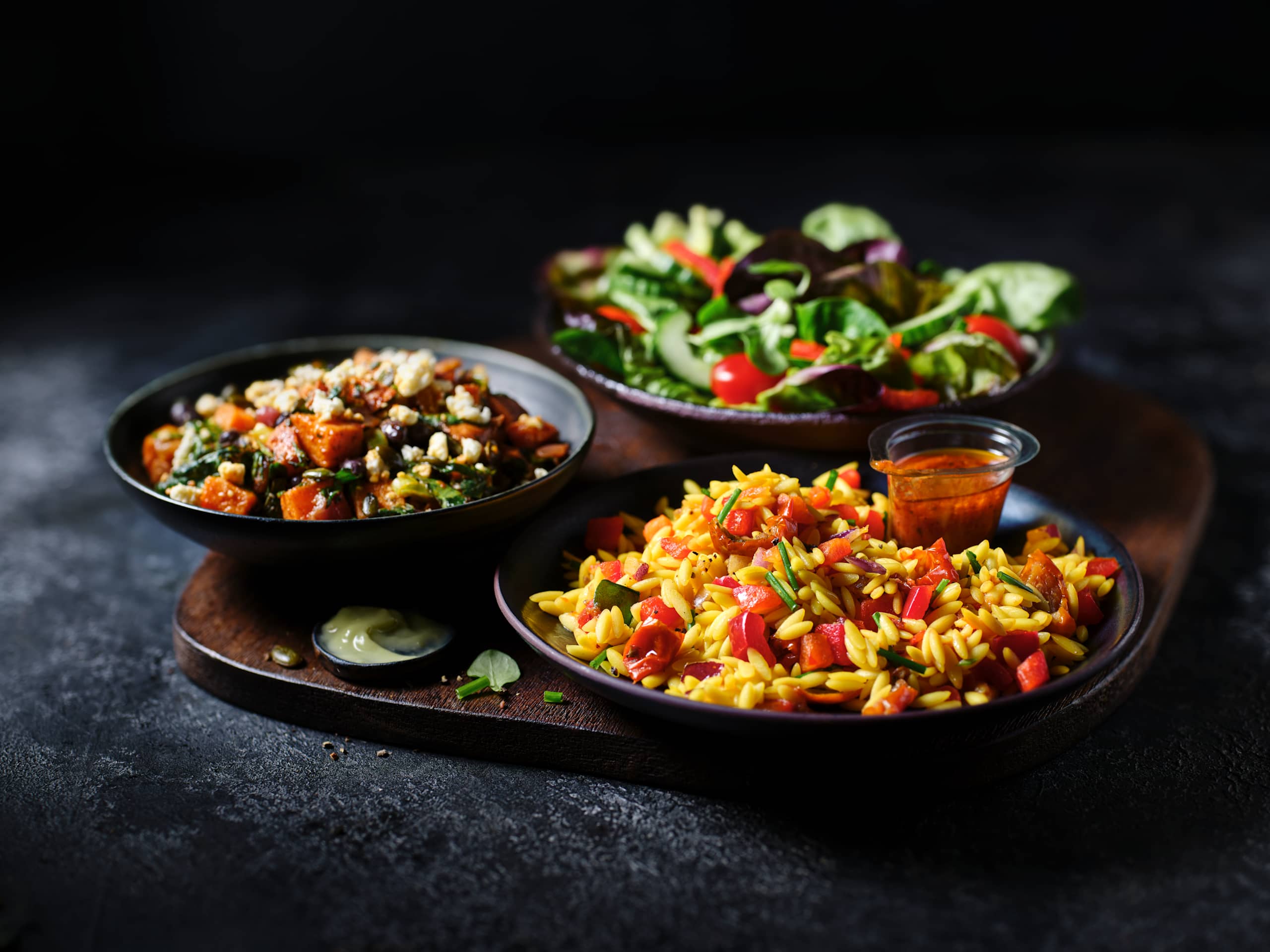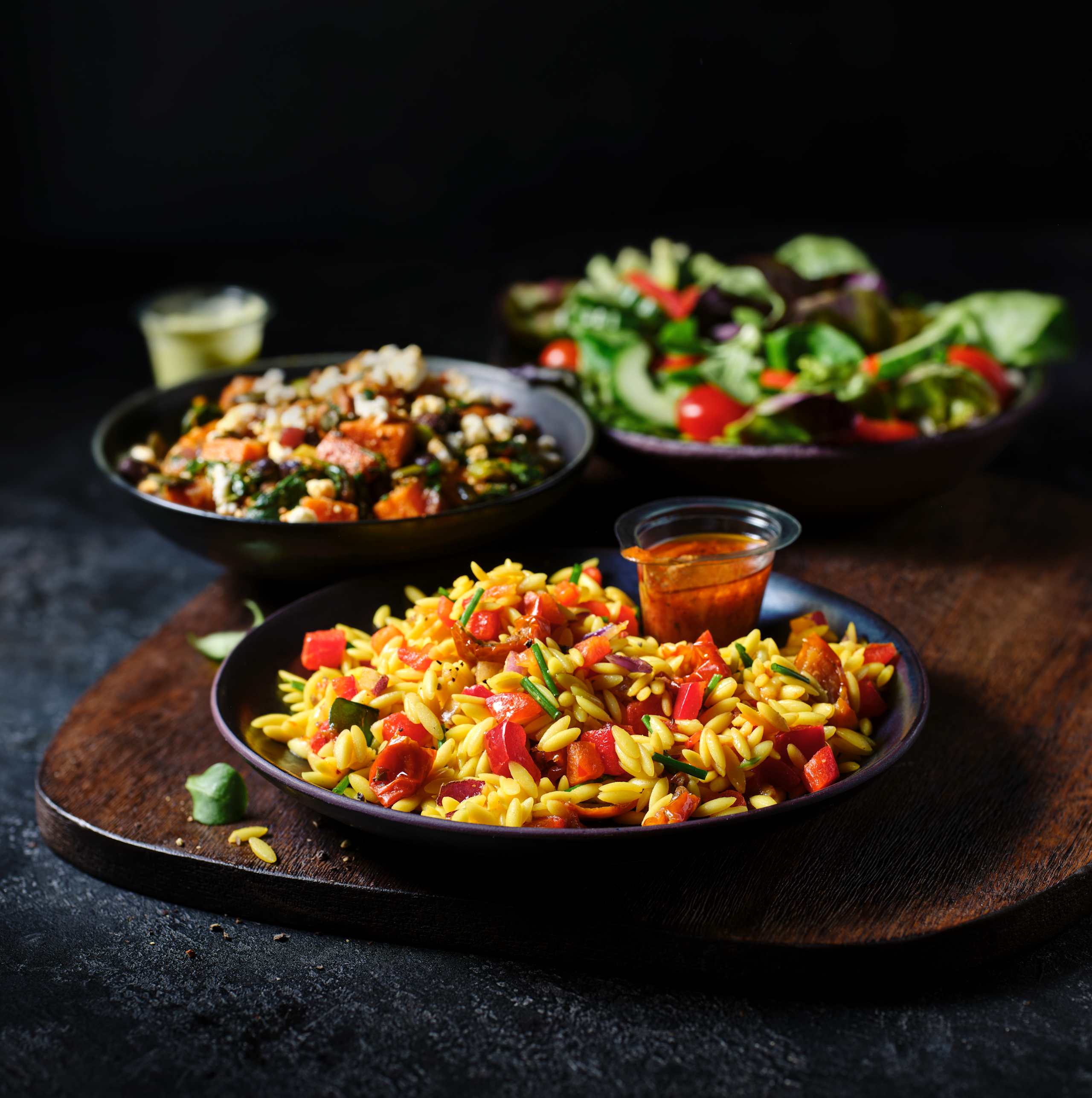 Sundried Tomato Vinaigrette contains Tomato Passata · Sundried Tomato Paste (Sundried Tomatoes · Sunflower Oil · Tomatoes · Sugar · Salt · Dried Garlic · Dried Oregano · Basil) · Concentrated Apple Juice · Basil Infused Vegetable Oil (Sunflower/Rapeseed) · Grape Vinegar · Water · Salt · Roasted Garlic Purée · Ground Balck Pepper · Rapeseed Oil.