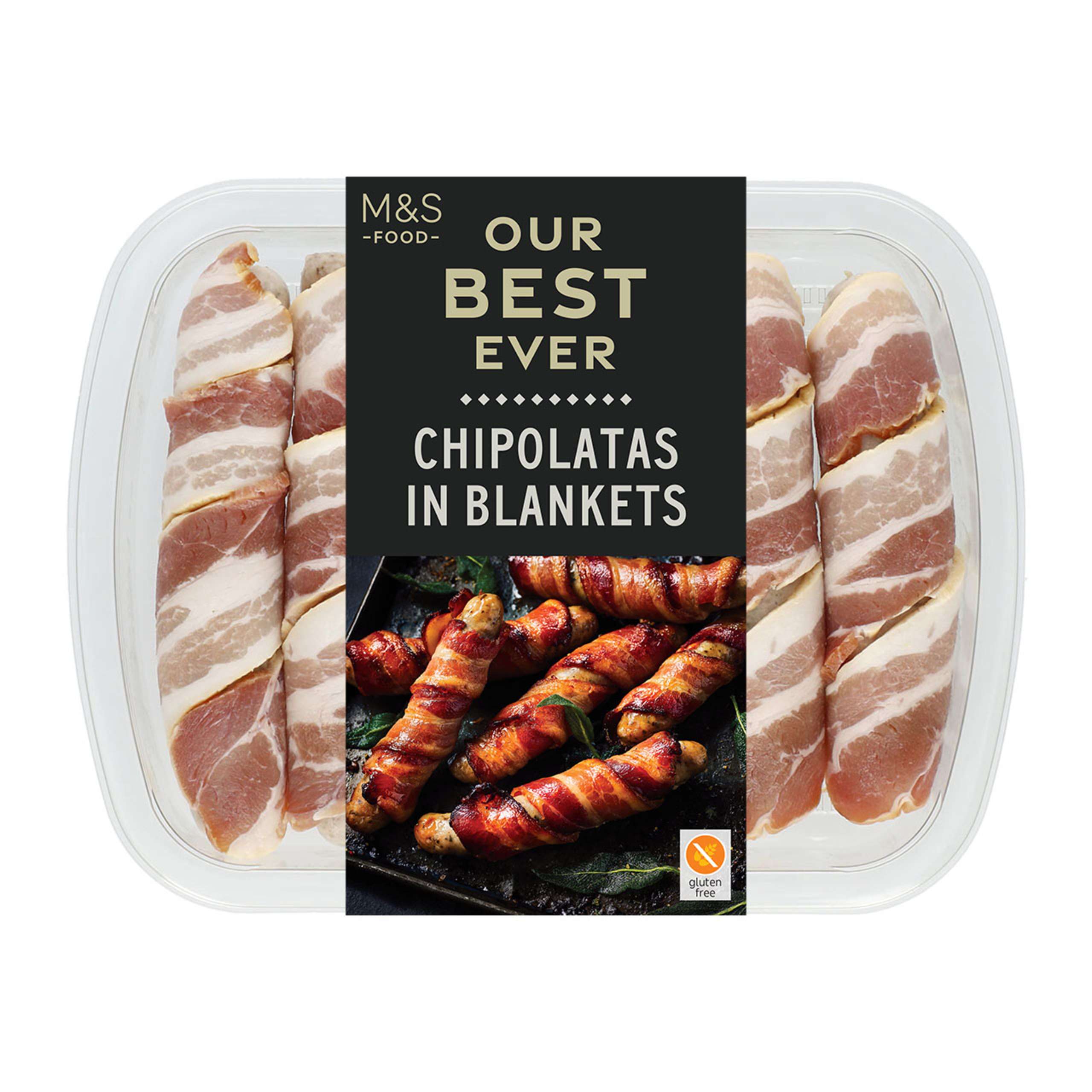 Perfectly seasoned chipolata sausages made from British outdoor-bred pork, double-wrapped in a whole rasher of oak and apple wood-smoked British bacon. The ultimate festive side.