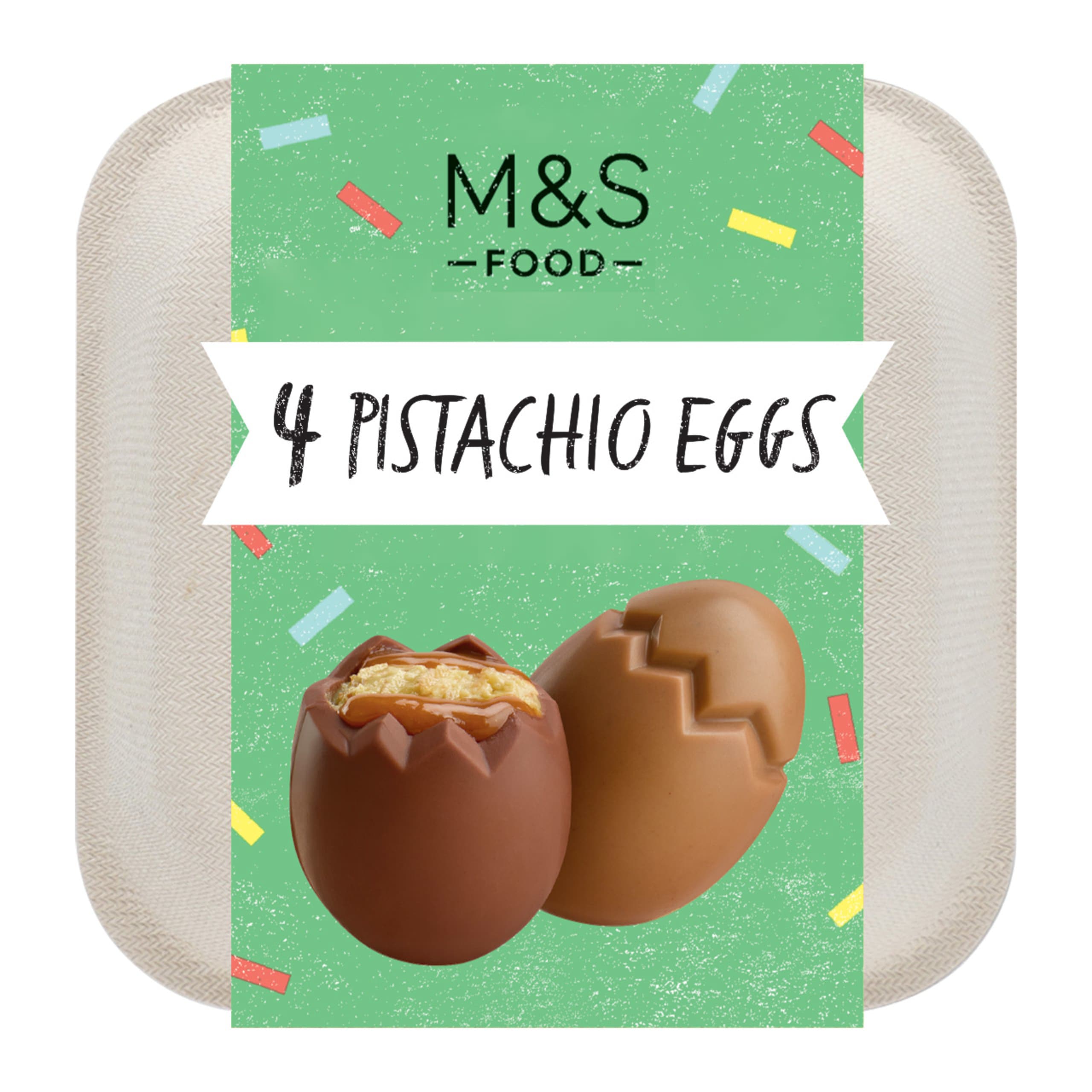 Our Pistachio Eggs are an eggstra gooey Easter treat. The two milk and two blond chocolate eggs contain a salted caramel filling with a creamy pistachio nut paste and a crisp wafer centre.