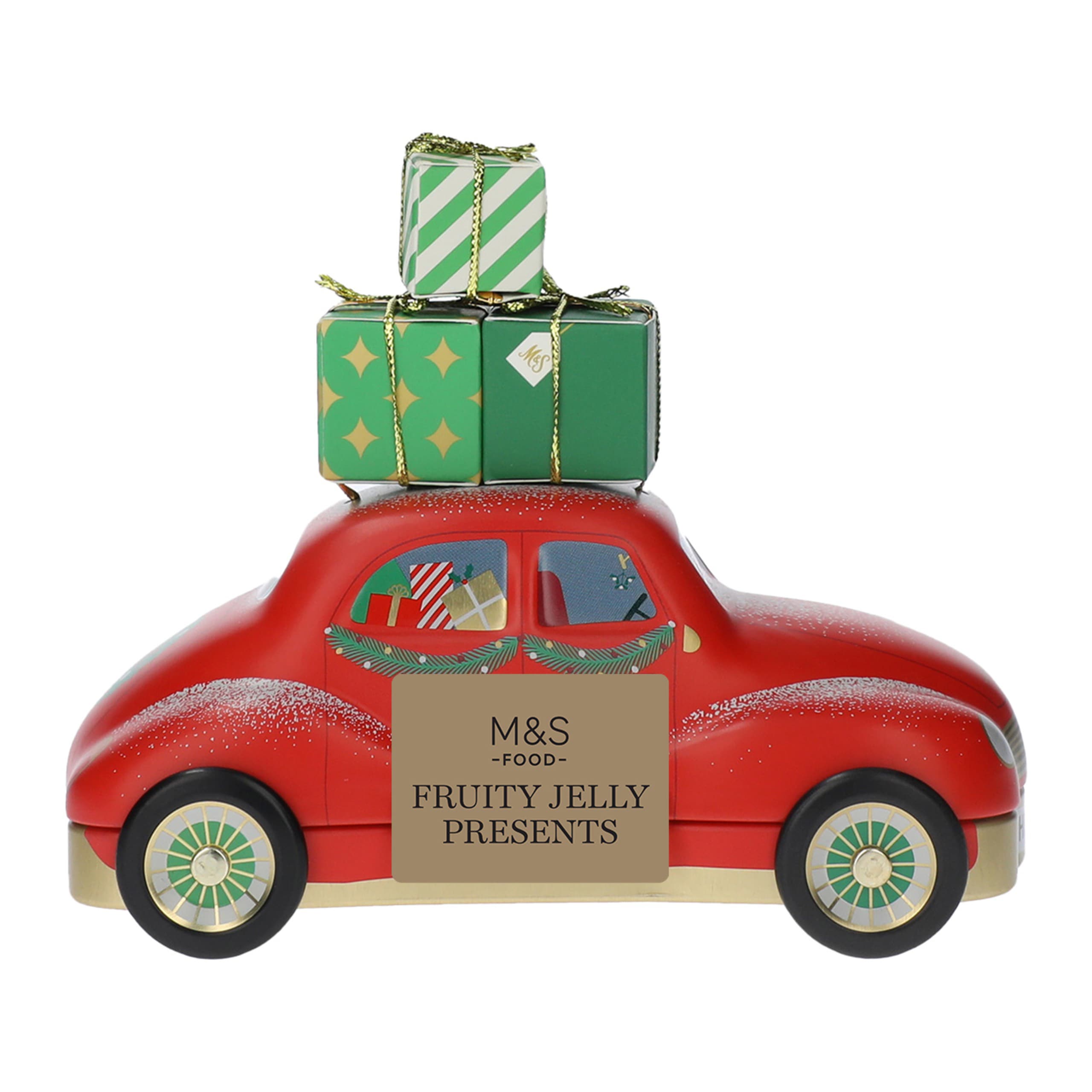 Our Push Along Vintage Car Tin is topped with presents and ready to deliver festive treats. Inside the special tin, find assorted jelly sweets, bursting with fruity flavours.