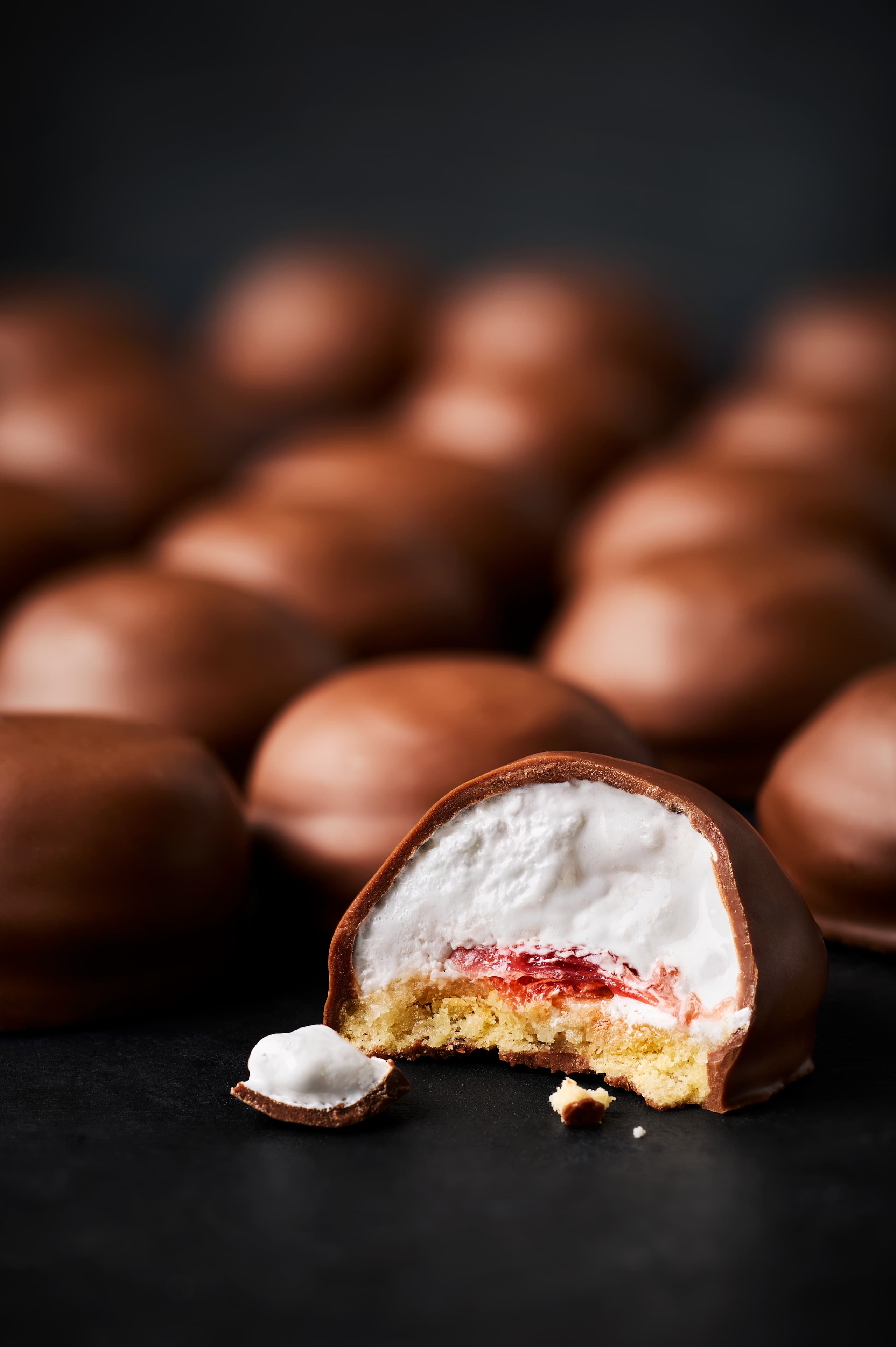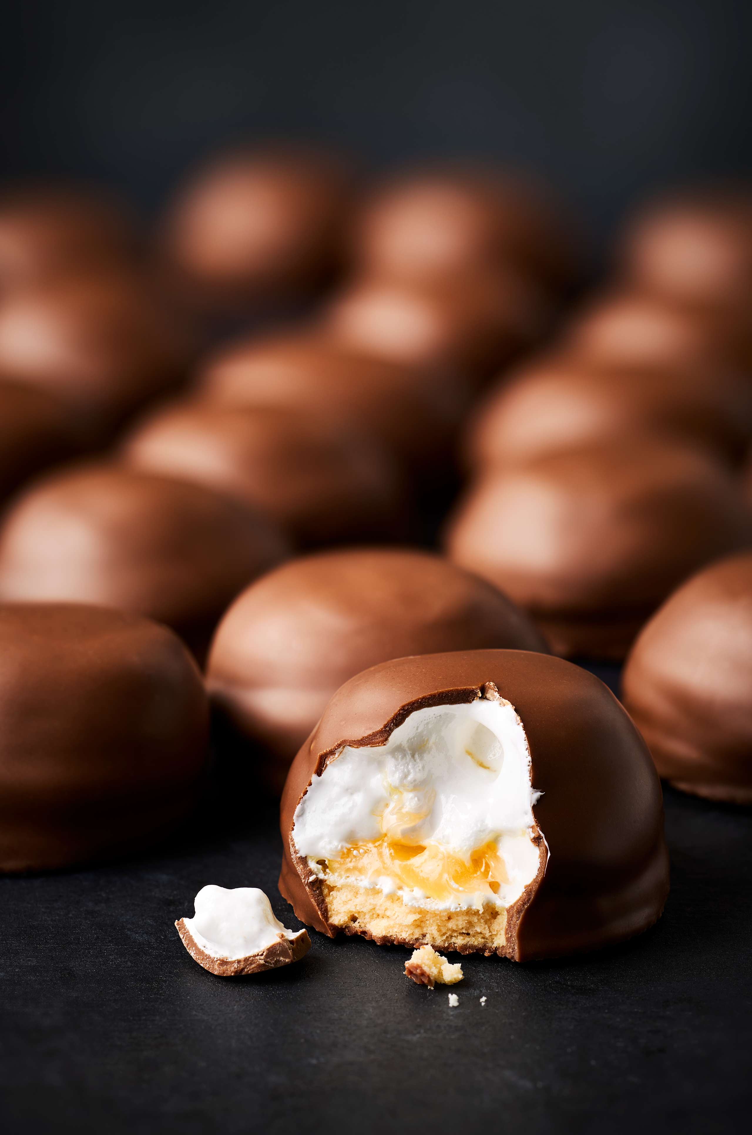 Sweet and tangy flavours make these Rhubarb Gooey Middle Teacakes a moreish afternoon treat. A vanilla-flavoured biscuit base, fully coated in smooth, creamy milk chocolate with satisfyingly soft rhubarb curd and fluffy mallow in the middle.