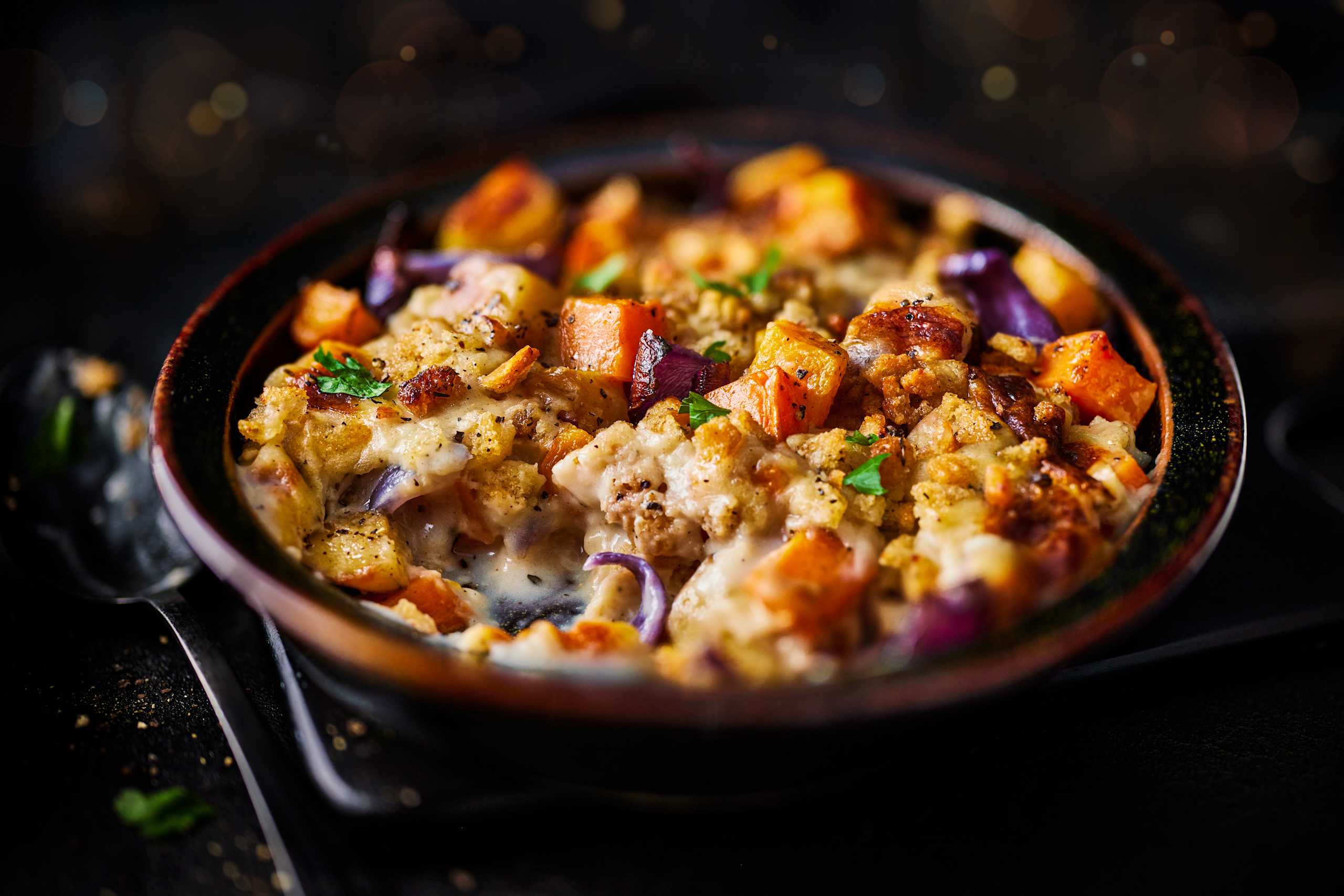Our Root Vegetable Gratin combines butternut squash, sweet potato, potato, swede, and red onions in a rich mature Cheddar cheese and mustard sauce. Topped with a golden, herby breadcrumb crust, it's a warming side for veg-lovers.