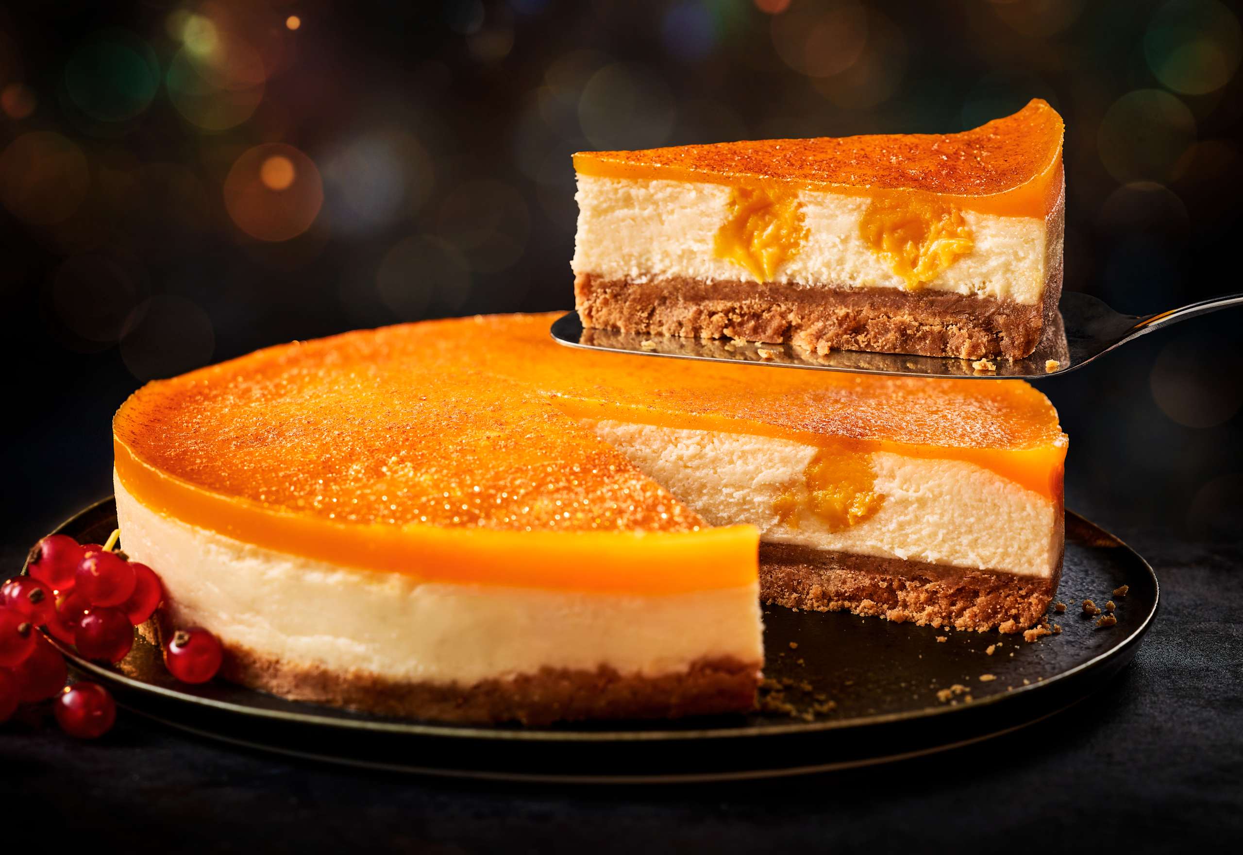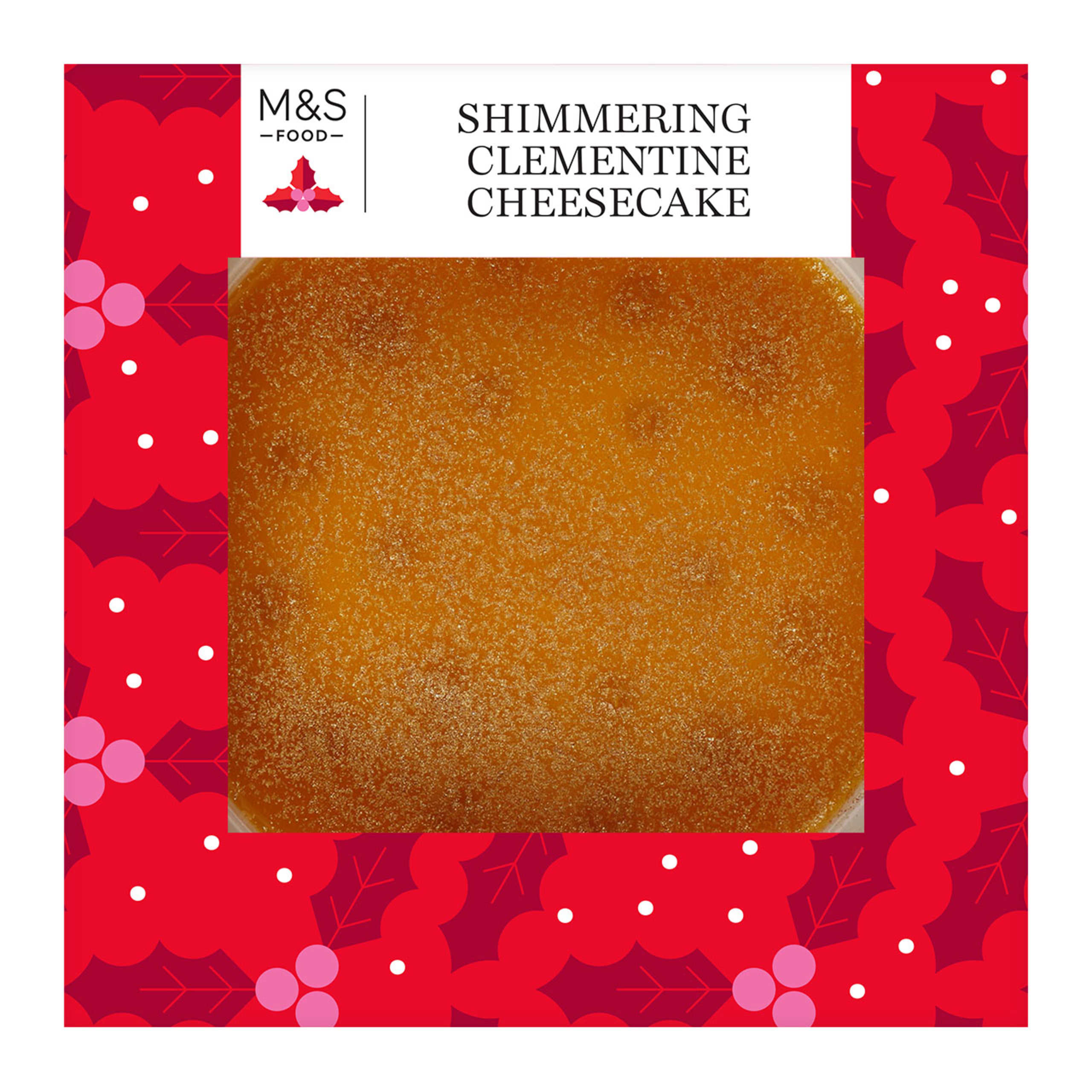 This festive dessert is rich, sweet and somewhat tangy. Creamy, baked vanilla cheesecake, infused with clementine sauce, sits on a crumbly digestive biscuit base. It's finished with a shimmering clementine glaze and a sprinkle of gold dust.