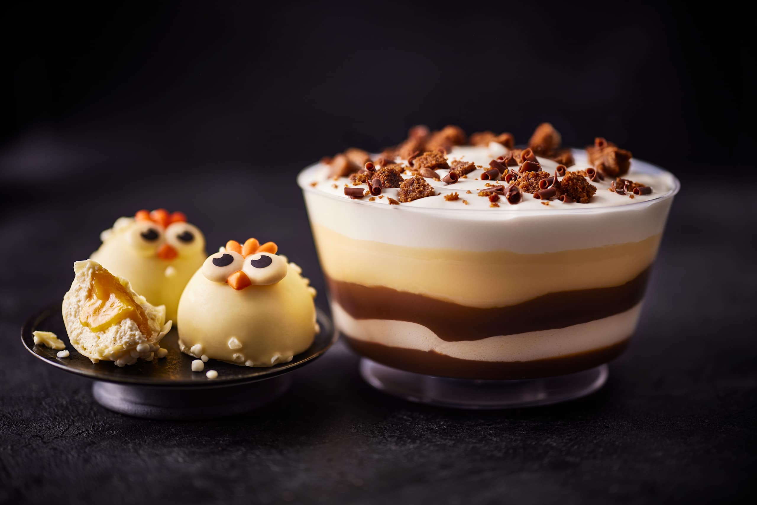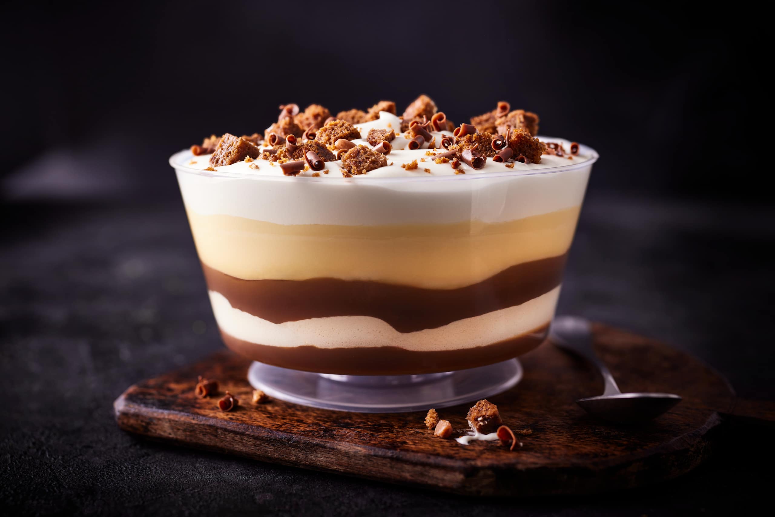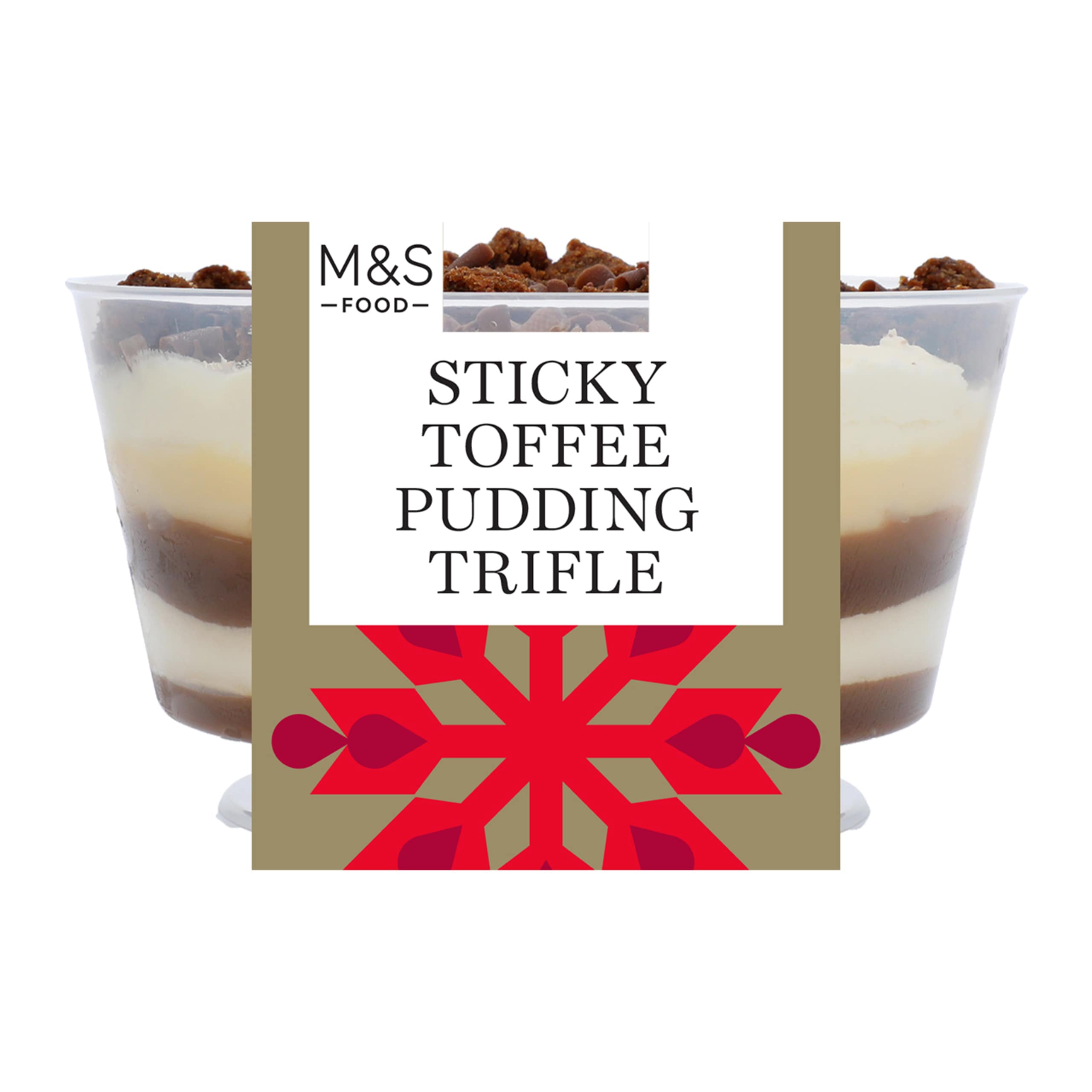 Two classic desserts combine in our epic Sticky Toffee Pudding Trifle. Layers of rich toffee sauce, fresh British whipped cream, luxurious vanilla custard and caramelised sponge are topped with sticky toffee sponge cubes, chocolate curls and butterscotch pieces.