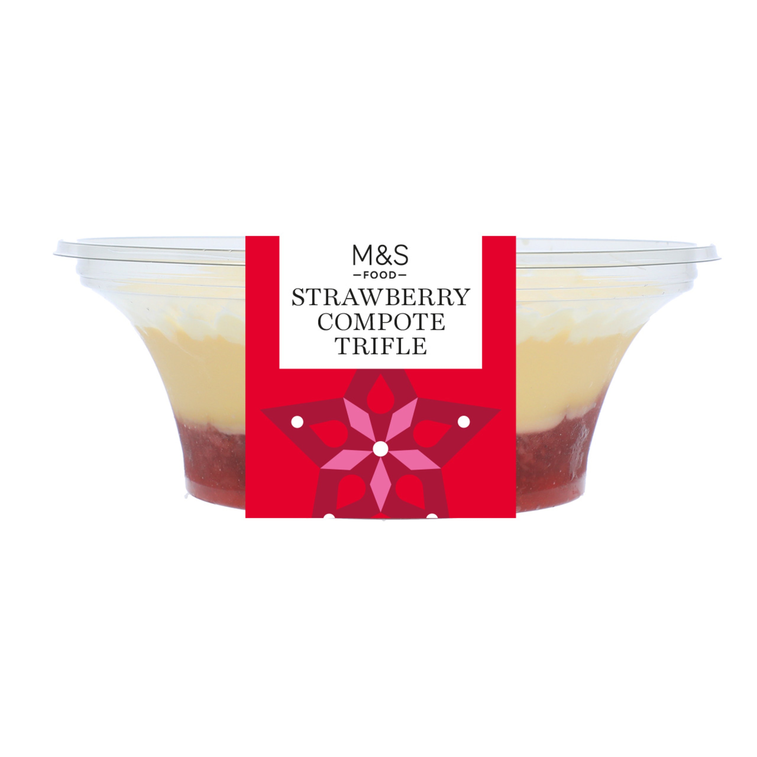 Made with British cream, our Strawberry Compote Trifle features layers of silky custard and fluffy whipped cream sit atop a light sponge, all enriched with a luscious strawberry compote.
