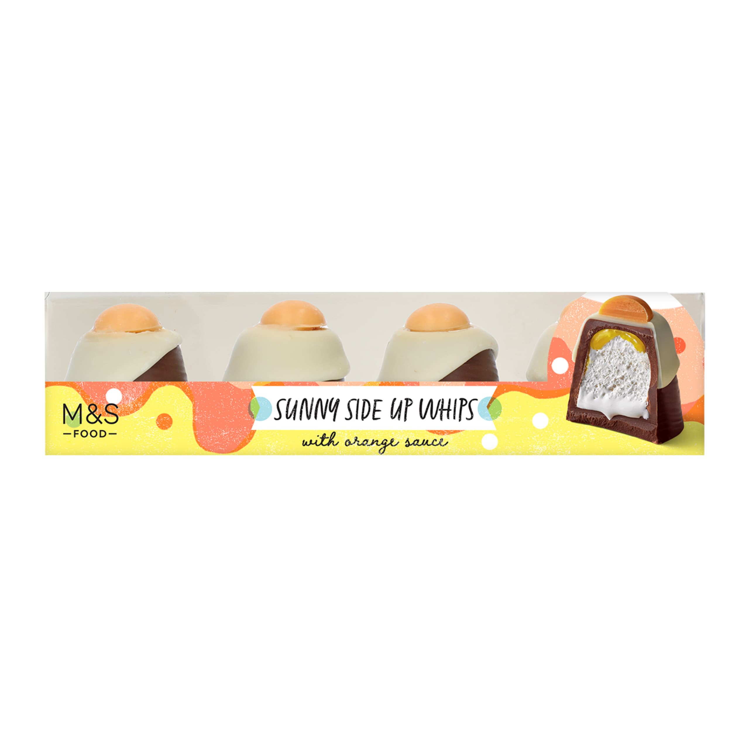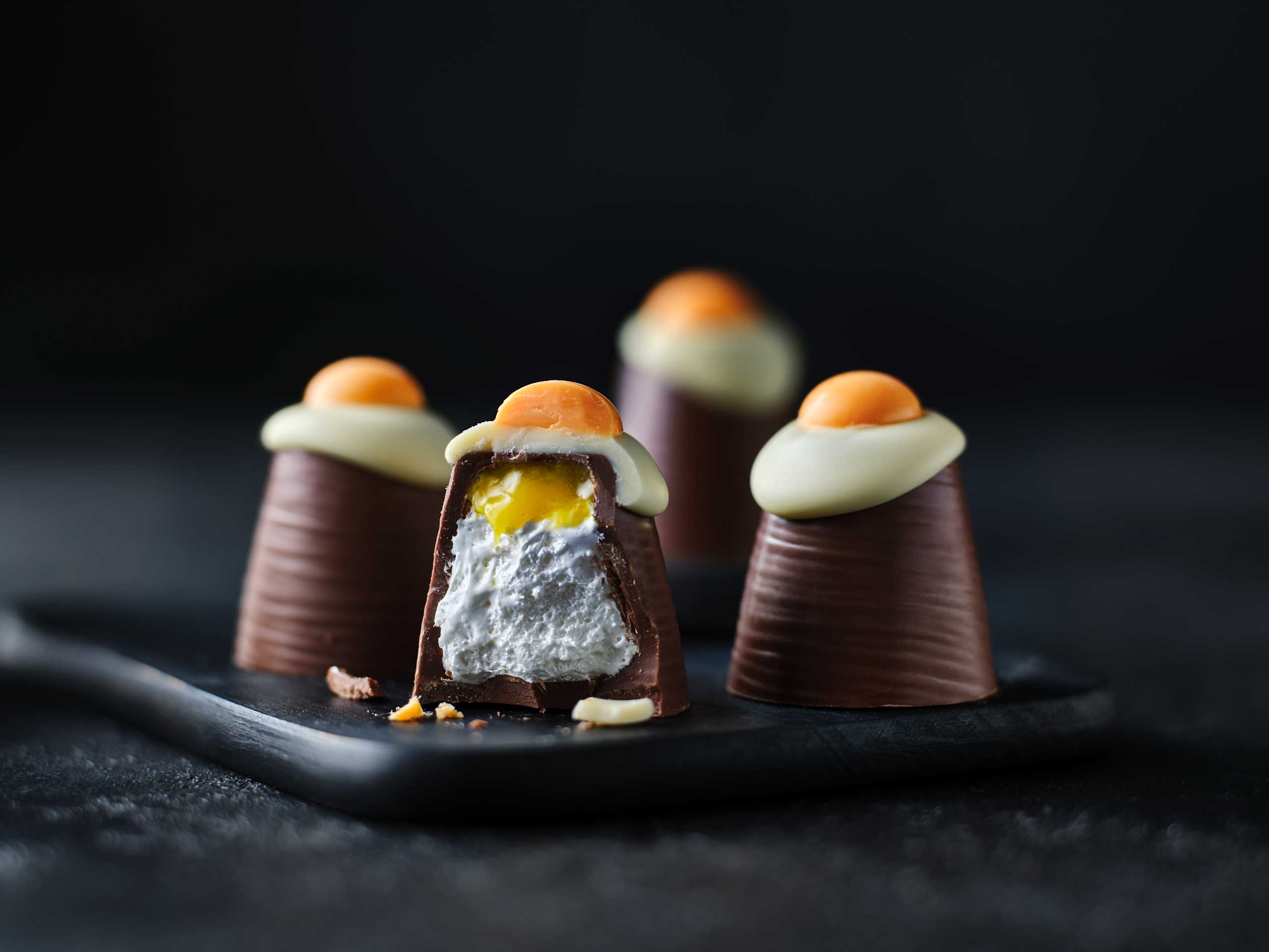 Light-hearted, gooey and hard to resist, our Sunny Side Up Whips are a cheeky take on a chocolate classic. These milk chocolate treats are filled with fluffy white mallow and a zesty orange sauce, and finished with a white chocolate topper that looks just like a sunny-side-up egg.