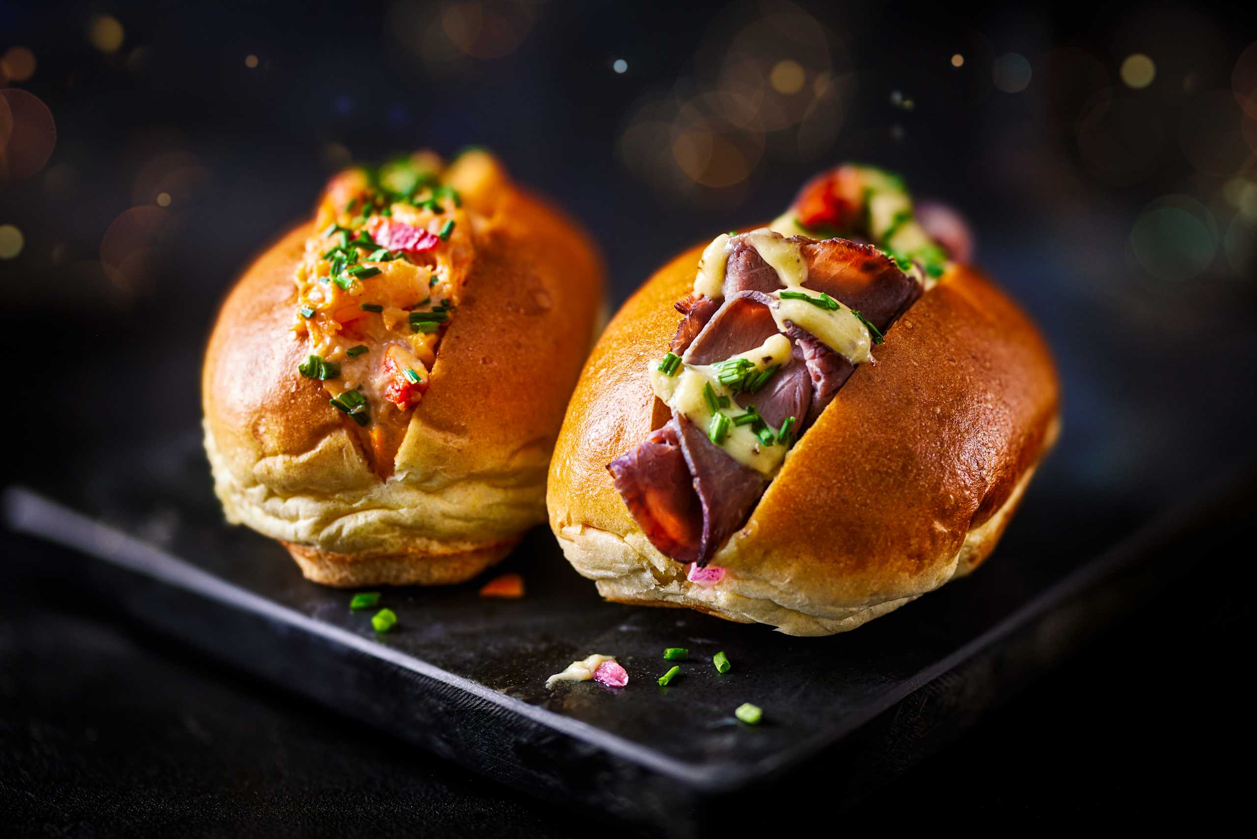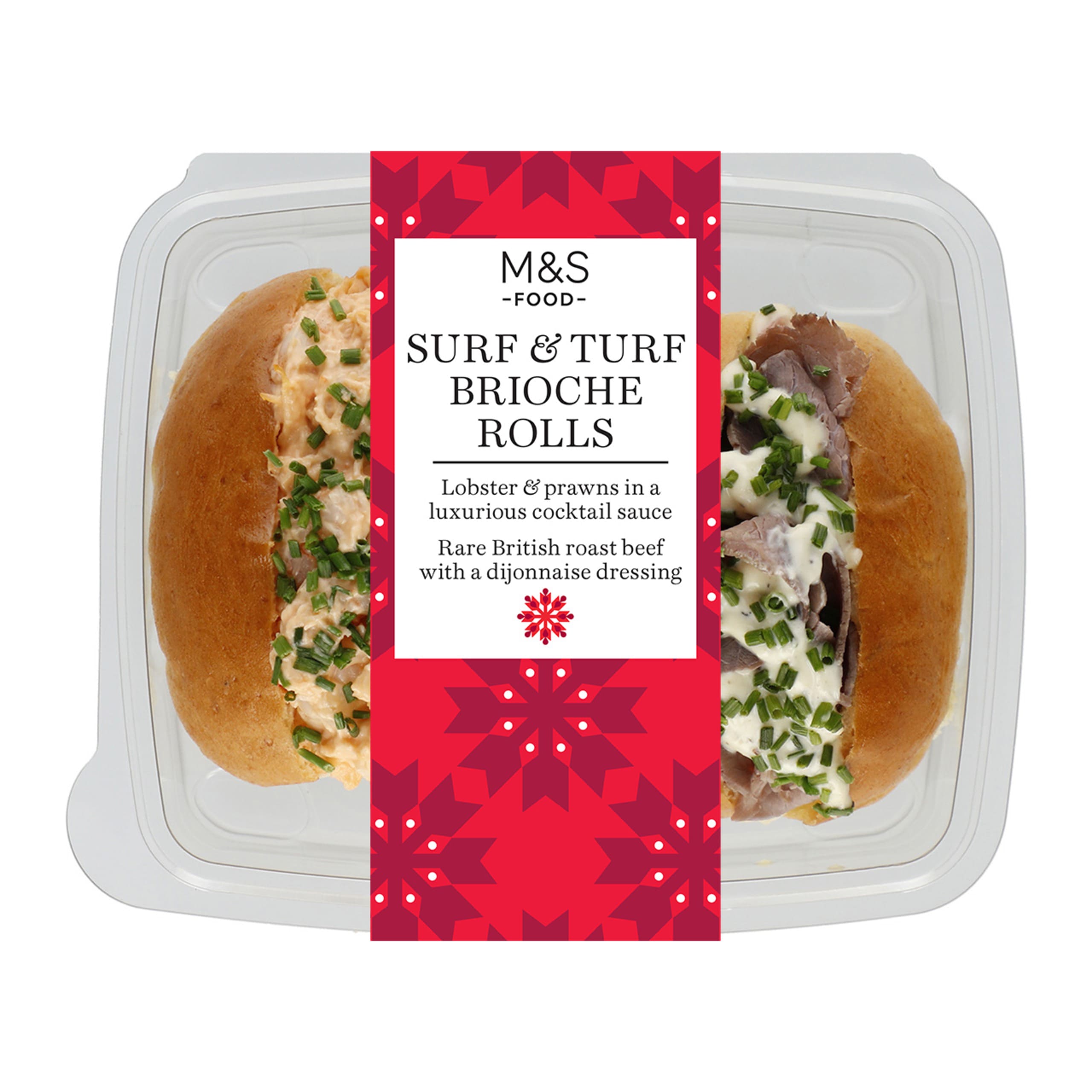 Our Surf and Turf Brioche Rolls are a luxurious duo. One is filled with lobster and prawns in a rich cocktail sauce while the other has British rare roast beef smothered with a distinctive dijonnaise dressing.