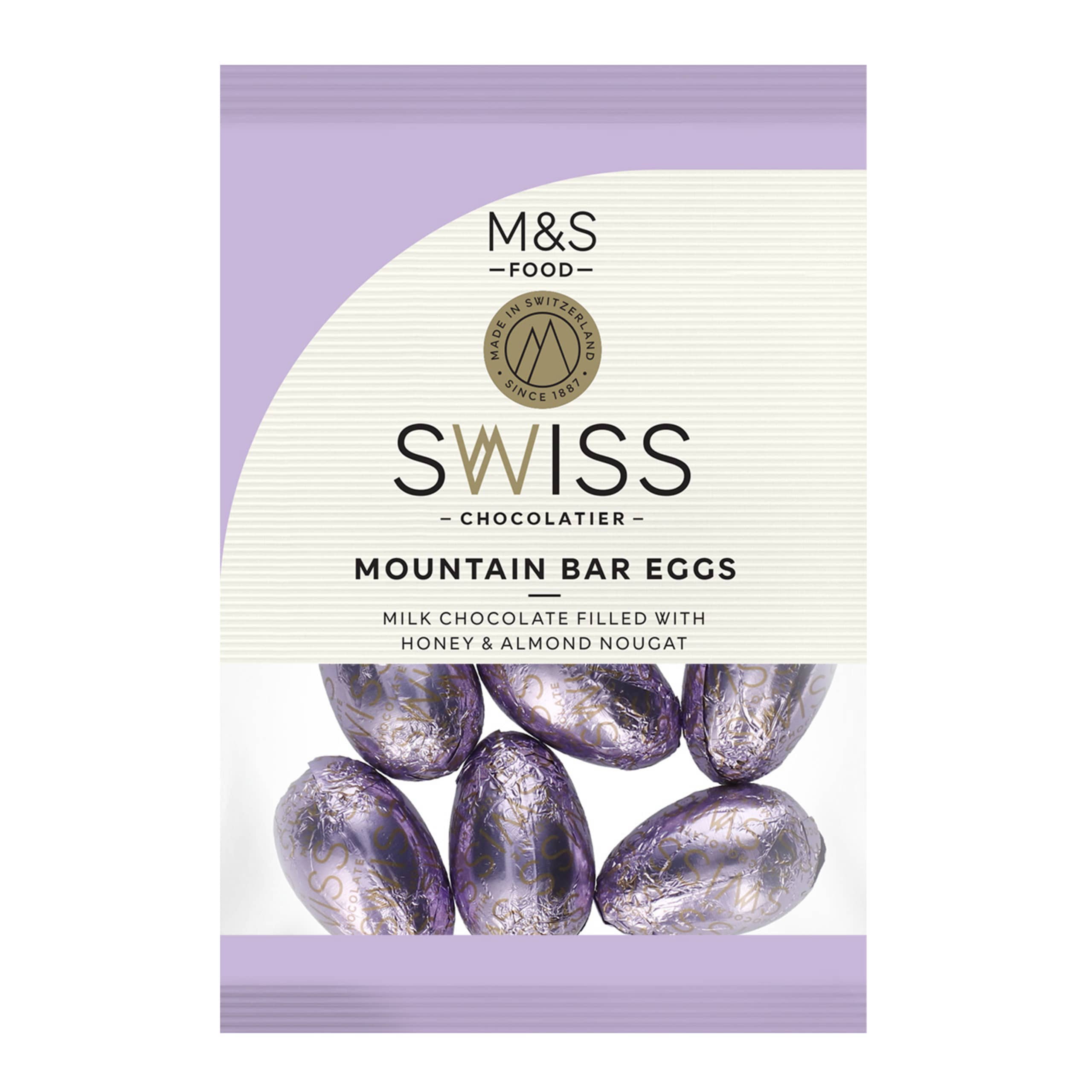 Our Swiss Chocolatier Mountain Bar Eggs are made with creamy Swiss milk chocolate, filled with creamy honey and crunchy almond nougat.