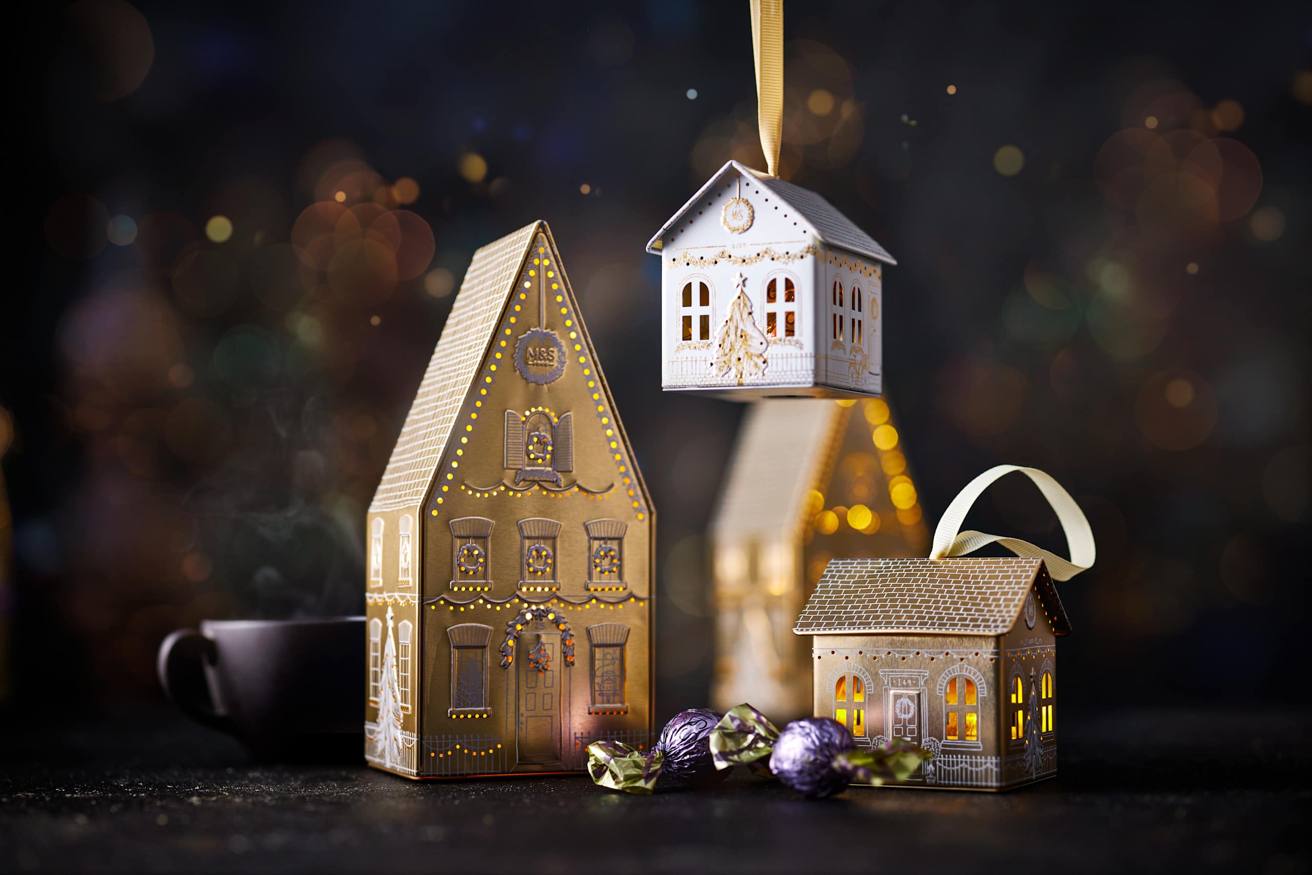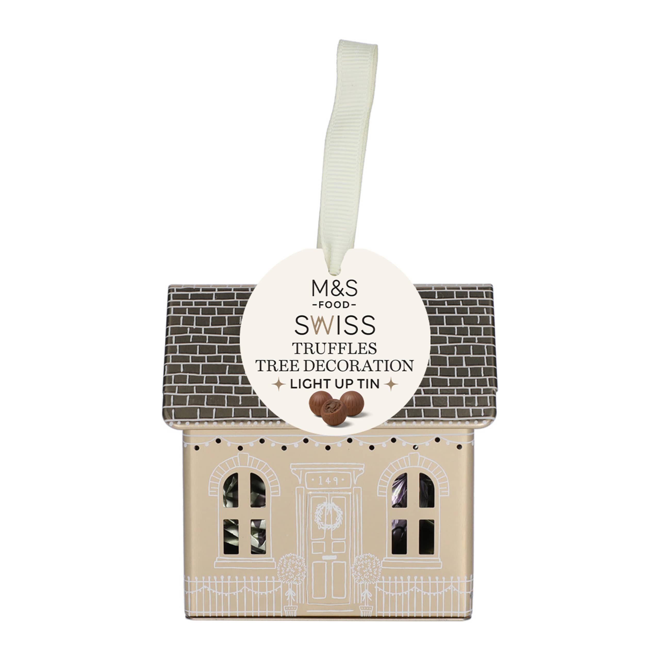 Our Swiss Truffles Tree Decoration adds a touch of indulgence to your festive decor. Each truffle is crafted with responsibly sourced cocoa, with a milk chocolate shell and a creamy hazelnut and milk chocolate filling. All presented in a charming light up tin that's ready to hang.