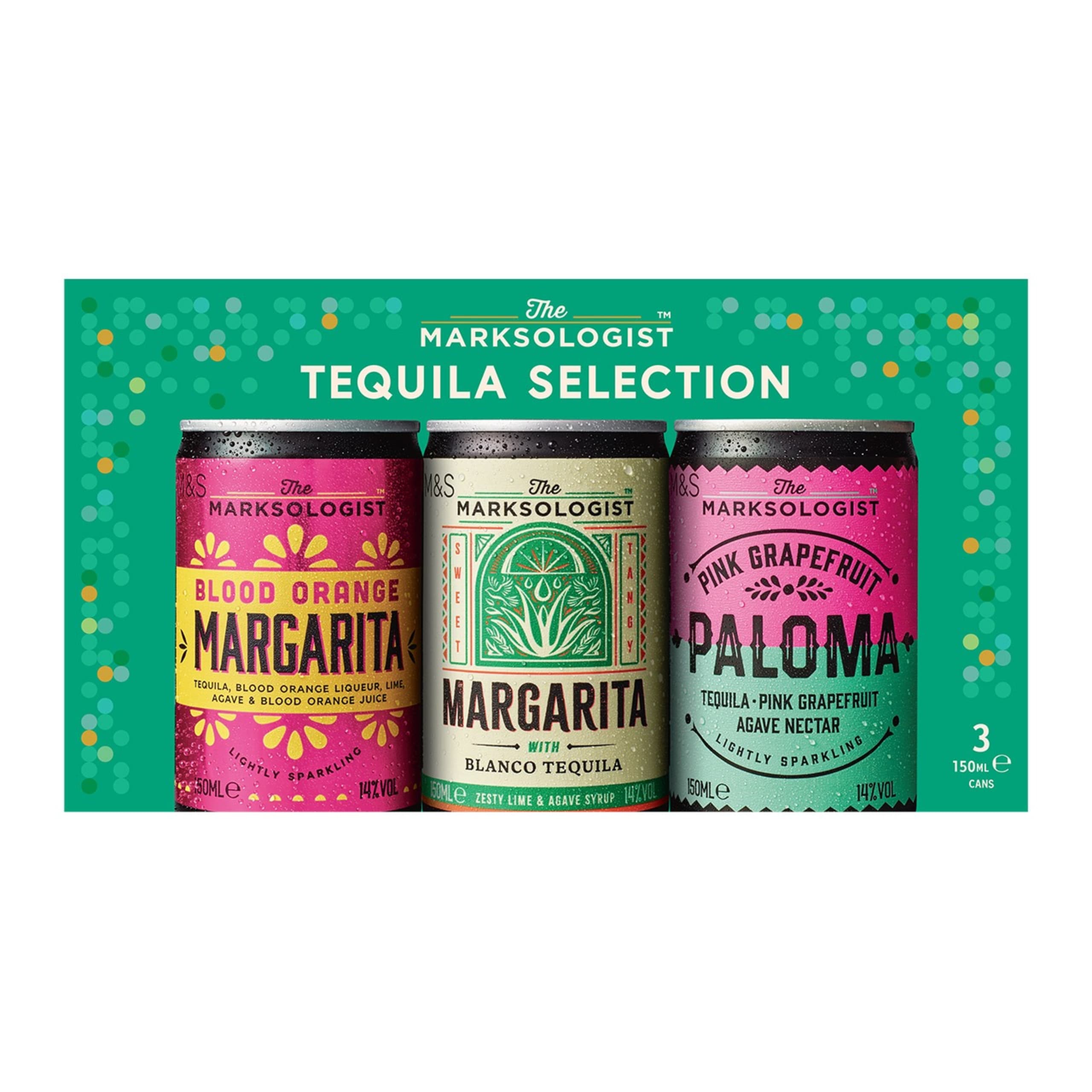 Recreate your favourite cocktail bar at home with The Marksologist Tequila Selection. This expertly mixed trio of ready-to-drink tequila cocktails includes a tangy blood orange Margarita, a classic Margarita and a citrusy pink grapefruit Paloma.