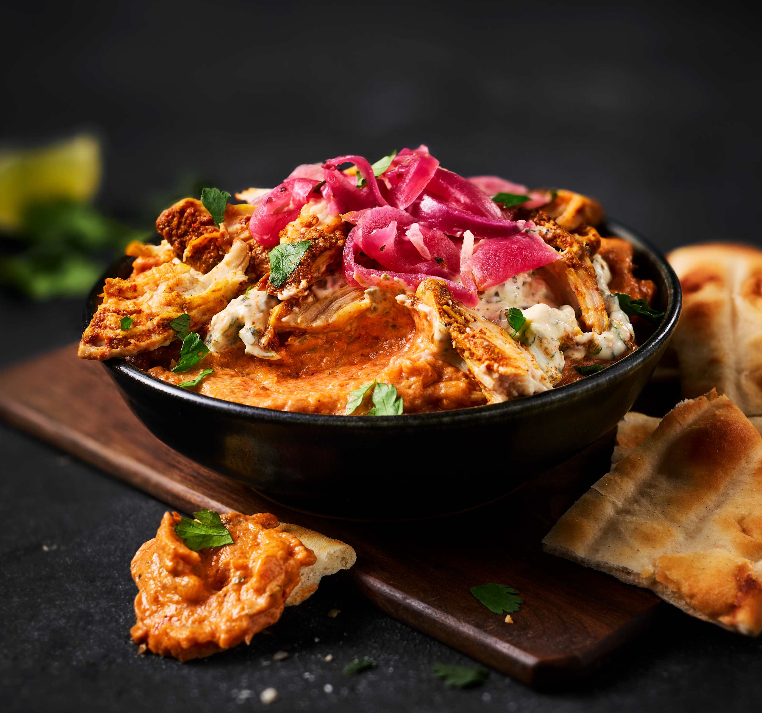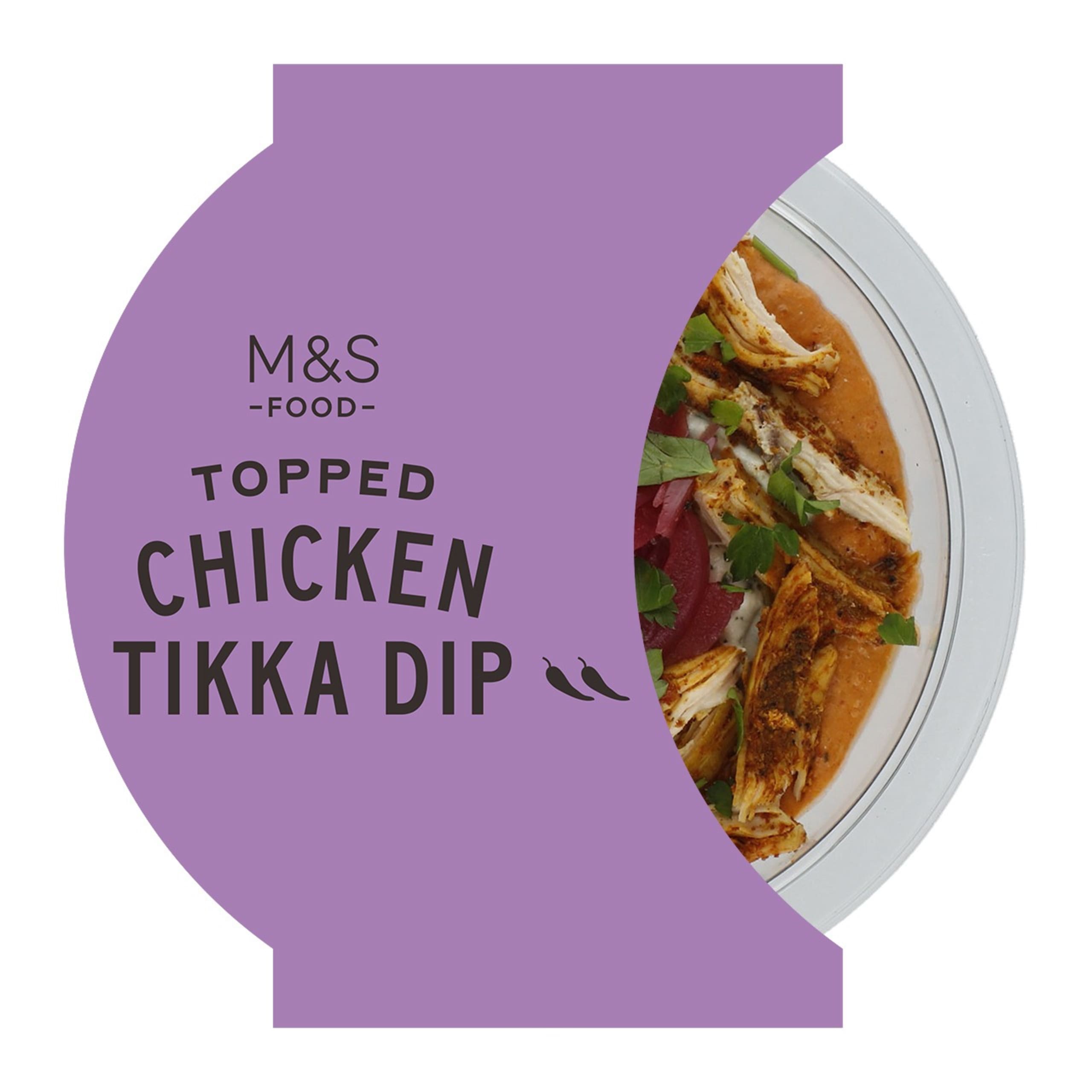 This richly layered dip brings together warming Indian inspired spices and fresh, vibrant flavours. A creamy tikka infused soft cheese base is topped with coriander and chilli Greek style yoghurt, tender M&S Select Farms chicken breast, pickled red onions and a sprinkle of parsley for a fragrant finish.