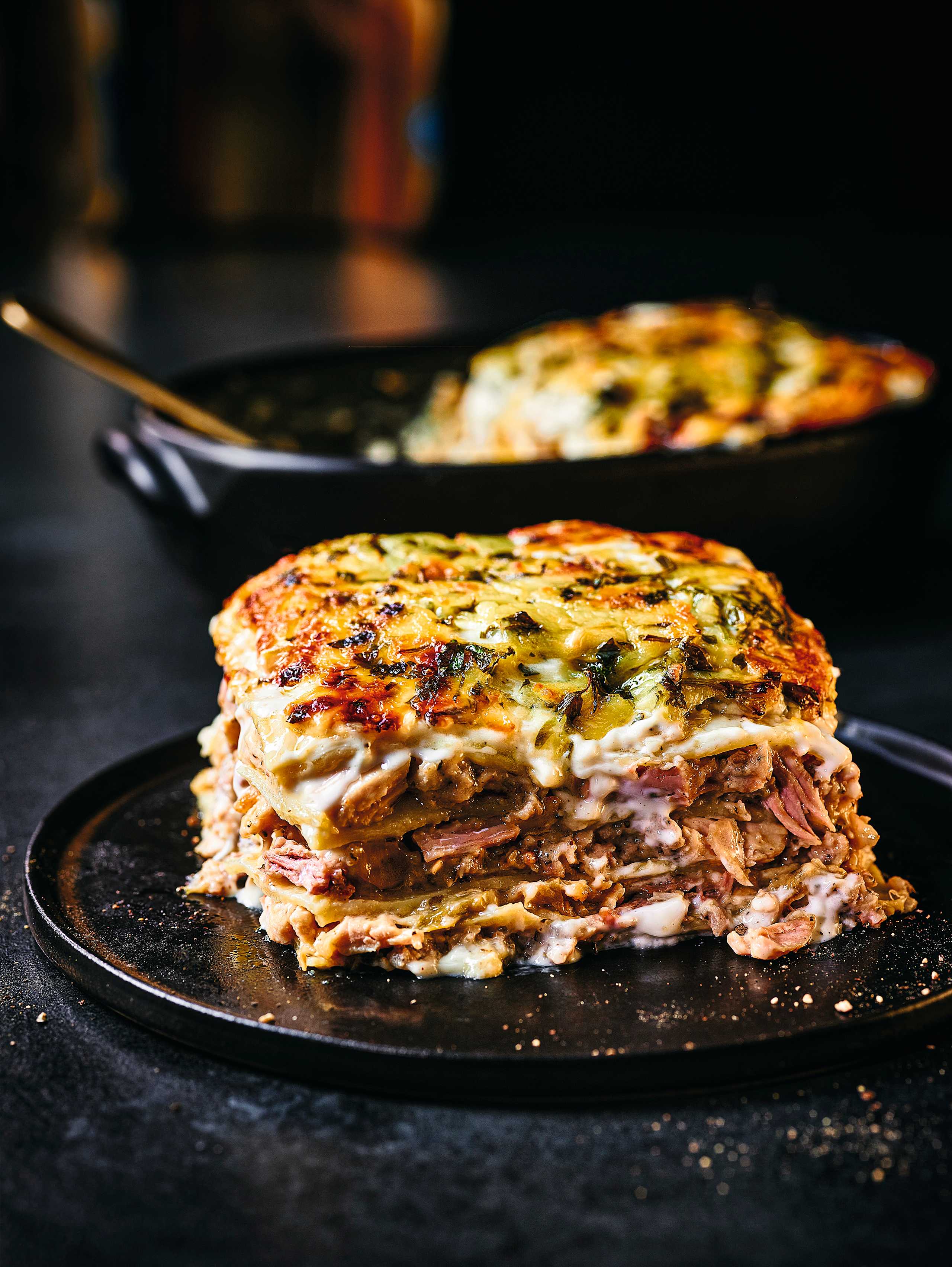 Everything you love about Christmas dinner meets a golden, bubbling melty lasagne in this epic festive mash-up. Italian egg pasta and slow-cooked turkey ragu are layered with bechamel sauce and a sausagemeat and cranberry stuffing, all topped with cheddar cheese and a sprinkle of parsley.