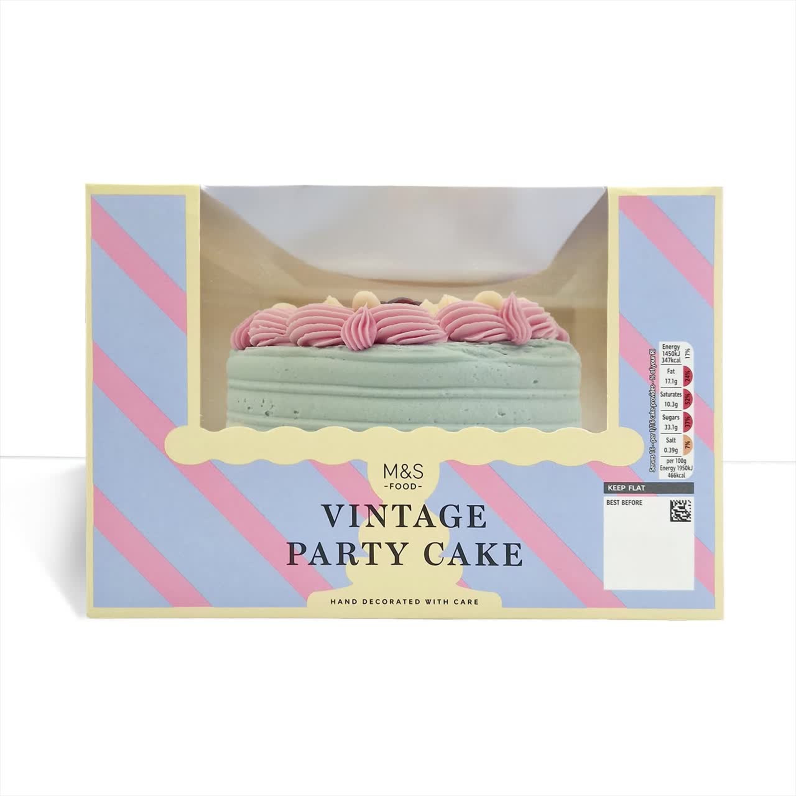 Bring a retro touch to your party with this vintage-style cake. The classic Madeira sponge is layered with sweet strawberry jam and smooth vanilla buttercream. Coated in even more colourful buttercream and finished with glacé cherries and white chocolate-coated shortcake balls.