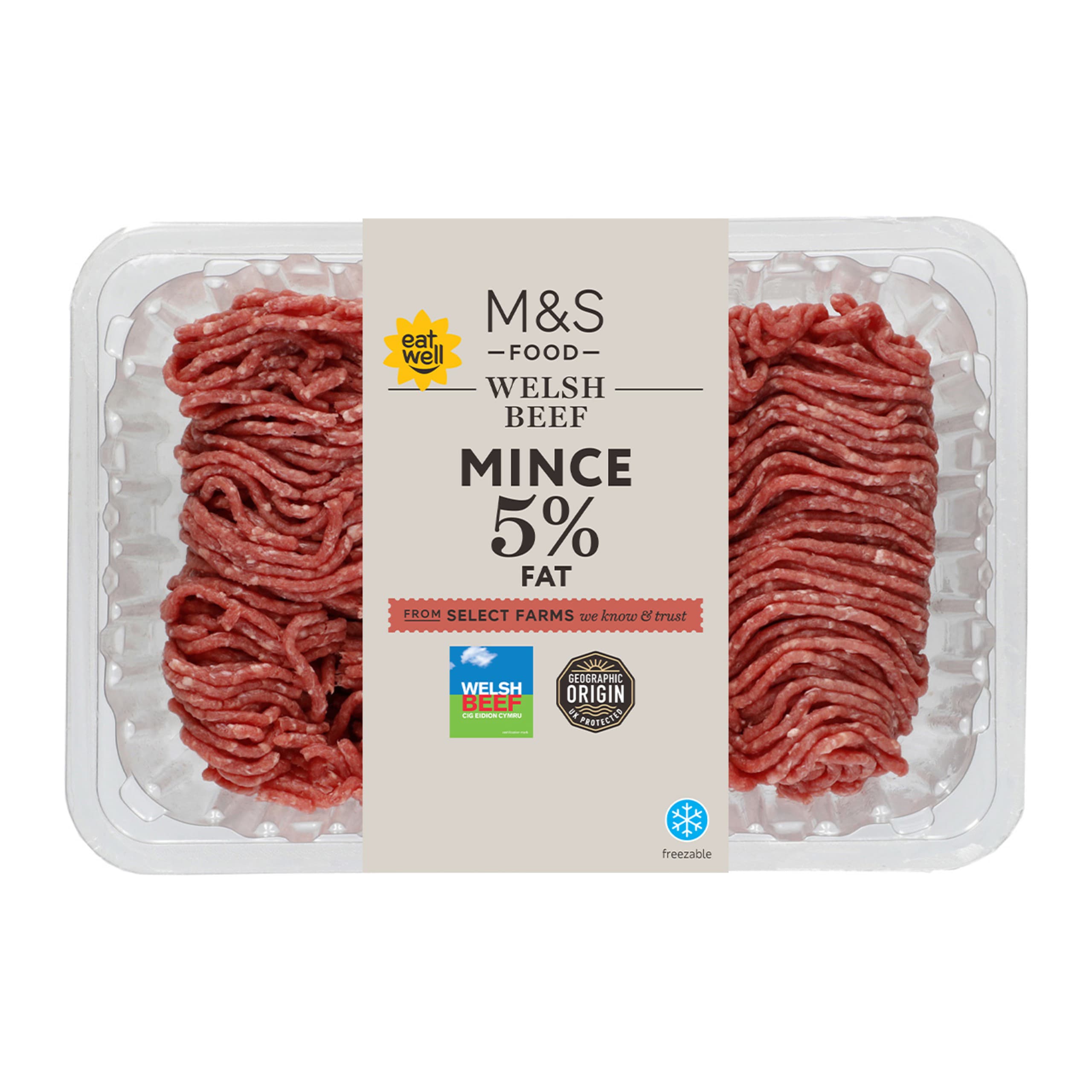 Sourced from M&S Select Farms we know and trust, our Welsh beef mince is fully traceable to the animal it came from. With 5% fat, this leaner option features our Eat Well flower so you know it's a healthy choice and can be enjoyed as part of a balanced diet.