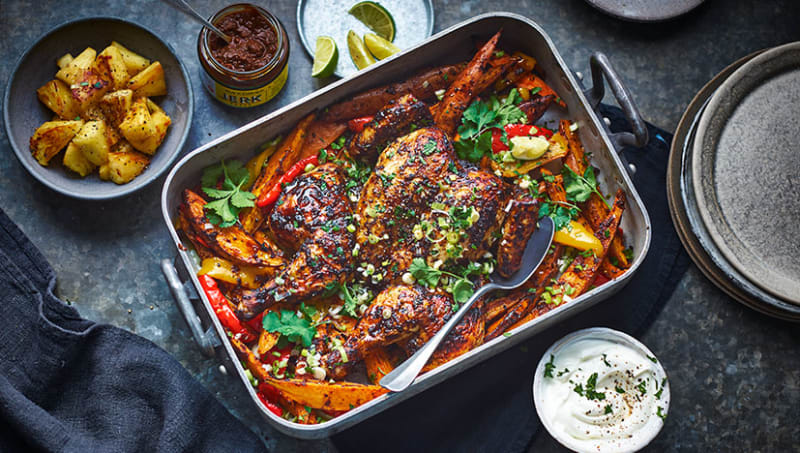 3. Place the sweet potatoes and peppers into a large roasting tray, then lay the chicken on top. Brush everything with the jerk paste to coat, then spread everything evenly out in the tray, with the chicken thighs skin-side-up.