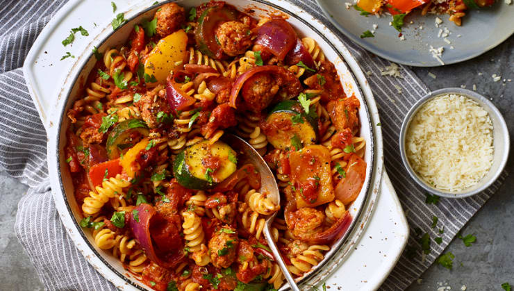 “This veg-packed pasta dish is so simple and satisfying. You could use Plant Kitchen posh dogs and leave out the parmesan for a vegan version – either way, it’s delicious”
