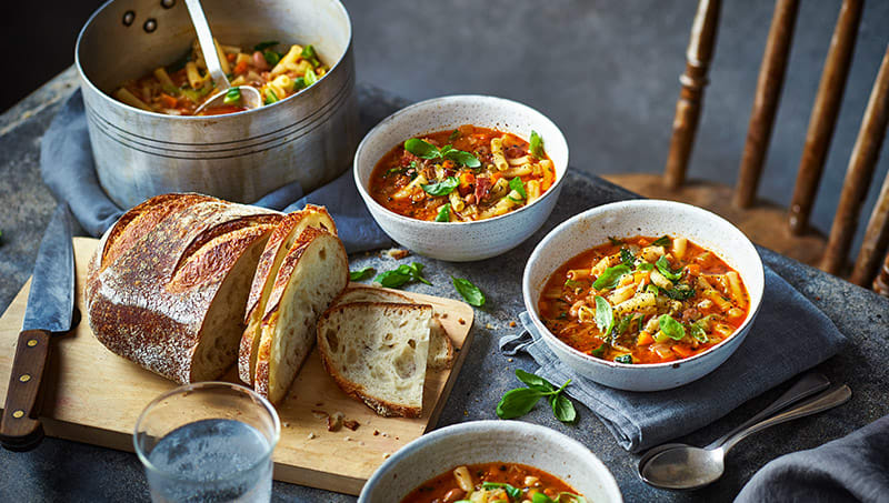 8. Serve topped with basil leaves, a grating of parmesan and a crusty baguette, if you like.