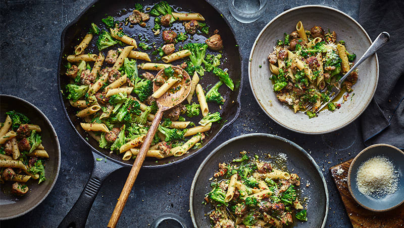 6. Toss the cooked pasta through the sauce with the fresh parsley, then serve with grated parmesan and black pepper. For a vegan version, substitute the sausages with Plant Kitchen sausoyges, and leave out the parmesan.