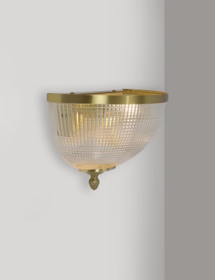 With polished brass metalwork and a textured glass style, this curved wall light has vintage-inspired appeal. Designed with a refracting design to open up your space this piece can also be complimented with other products in our Eliza range.